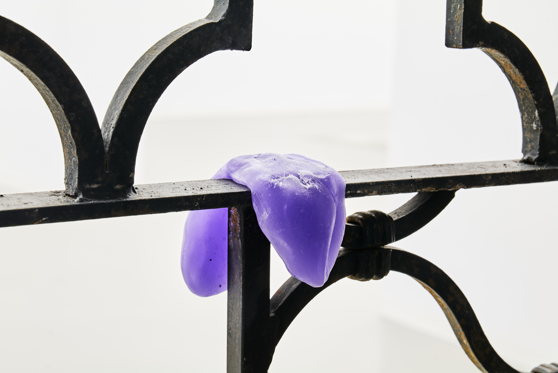 Thick skin - where are inside and outside? What and who stays outside or comes in? Permeable and repellent like the skin is the site-specific work "bouncer" that marks the entrance to the show. Iron window bars, which the artist found as objets trouvés and reassembled, initially shield visitors from the exhibition space, but already allow insights through the bars. "bouncer" also invites visitors to interact. If "Dicke Haut" wants to be entered, the skin of the "bouncer" must first become physically (not just visually) permeable, the gate must be pushed open. The "bouncer" describes the threshold to the exhibition, which is functional in both directions: it lets people in, it locks them in, and at the end it lets them out again.