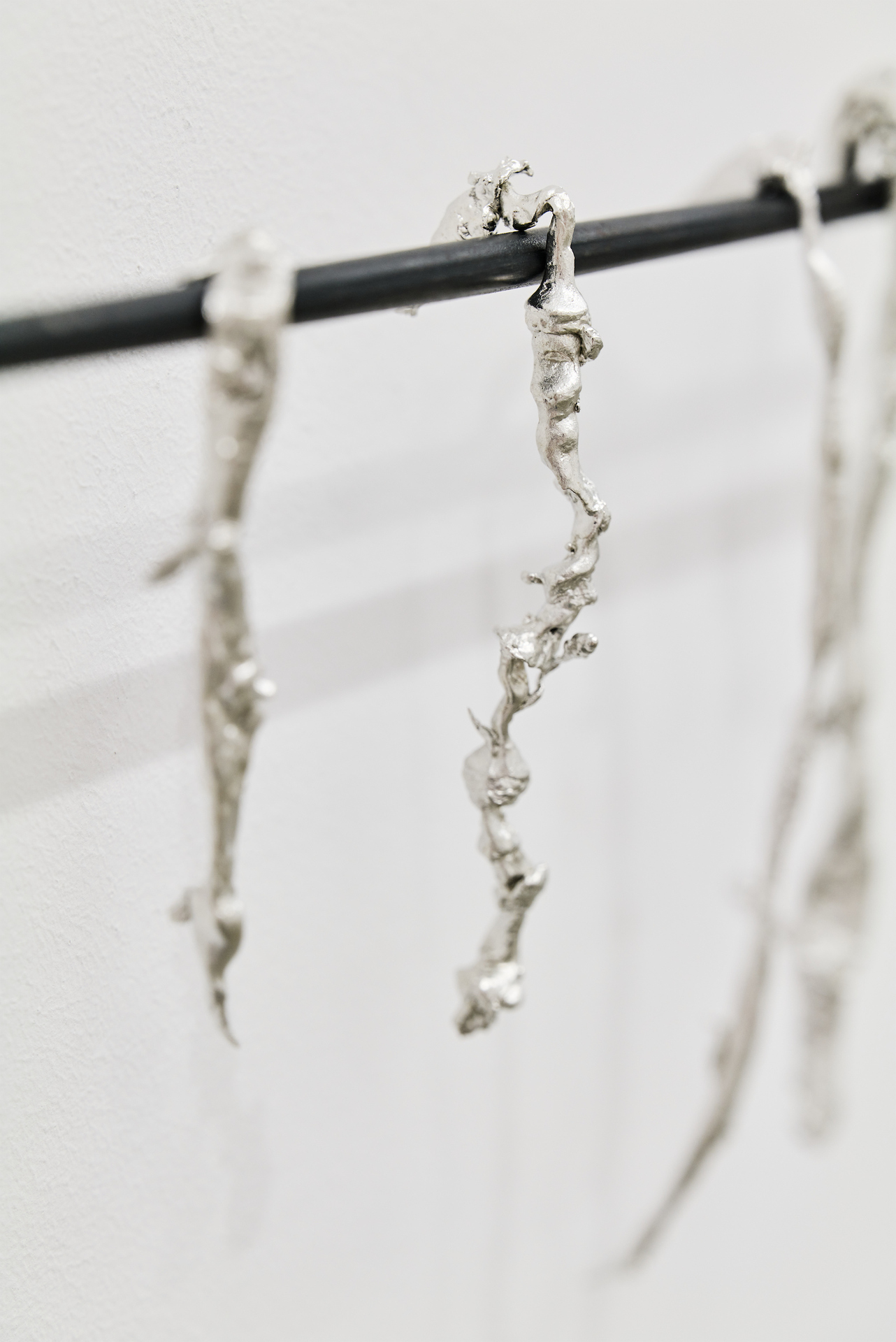 Liquid becomes hard. Soft becomes solid. In the installation "tears of tin (dry a.f.)" the tears are dried, hardened, fixed. Berchtold has placed ten elongated tin drops in sequence on a towel rack. Already presented in a similar form in the installation "floor work" (2021), the tears are, however, more coarsely worked and larger. They emphasize verticality, the moment of flowing down. Nevertheless, the tears are 'dry as fuck' - as the title of the work points out. They have transformed their initial liquid form through the hardening process of their material. On a semantic level, the tears are strung together like memories on a towel rack. Time has passed since they flowed, their relevance lost.