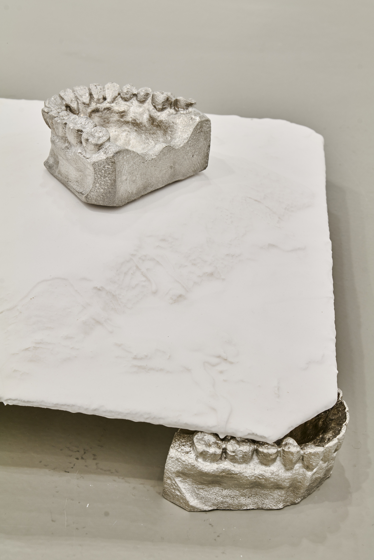 Similarly, the work "untitled bunch" installed on the floor evokes questions of belonging, of inside and outside. Using the word bunch, which describes a bundle, heap, or gang, the bits cast in pewter can be understood as a gathering. Ripped mouths, potentially chattering, talking, laughing, come together as a community. Thus, three dentures support a monochromatic white rectangular plaster plate on which two other upper jaws rest. One of them is placed at the edge, threatening to fall down. Outside the slab, scattered in the surrounding space, are three more pewter casts. Some seem to be facing the slab, one seems to be turning away. How do the casts relate to each other? And how to the plaster slab? Is it the site of their meeting?