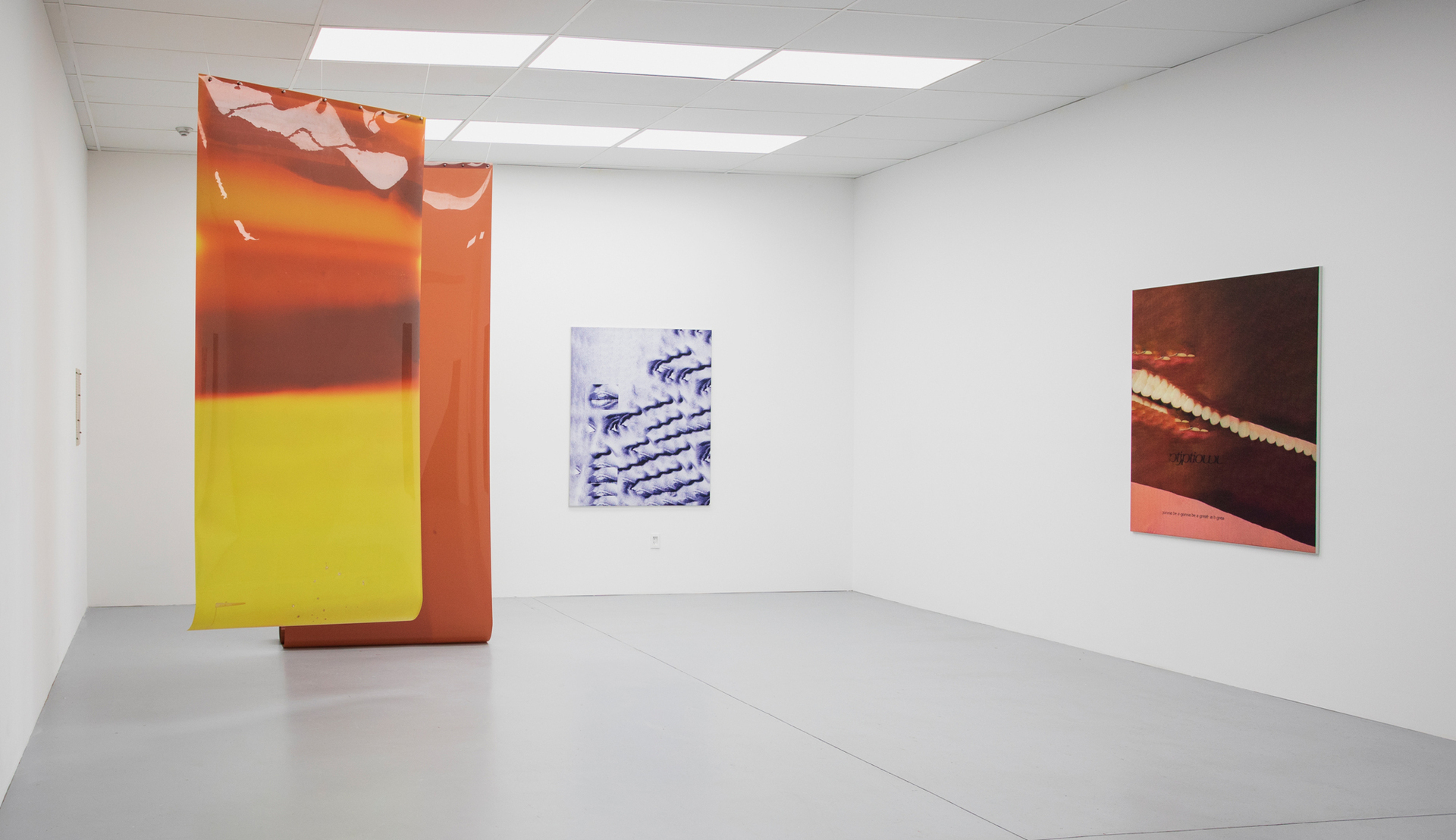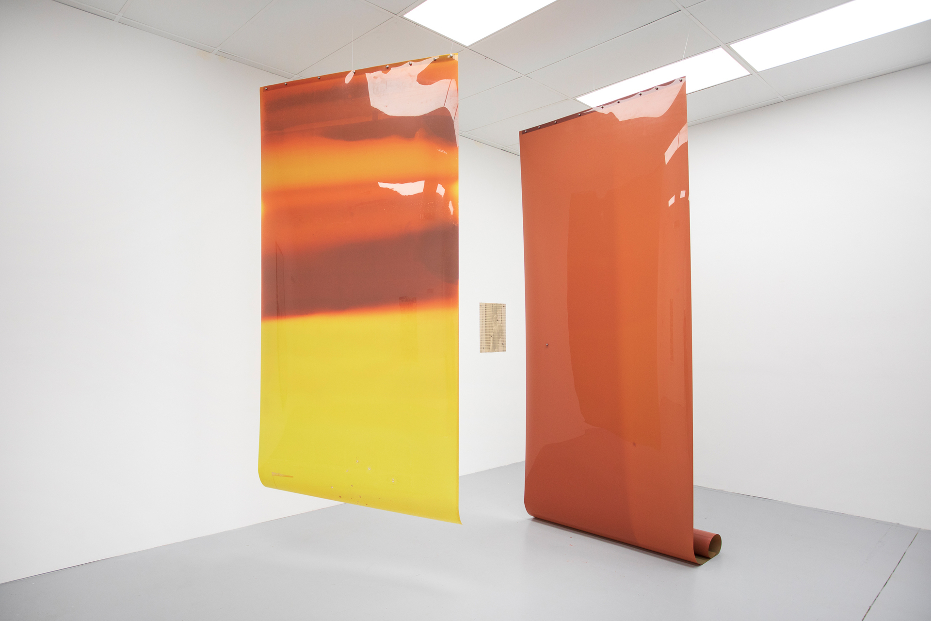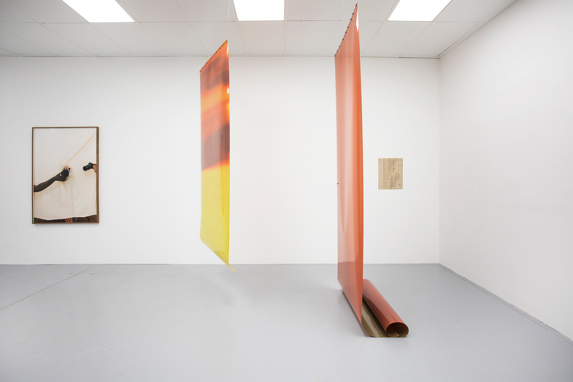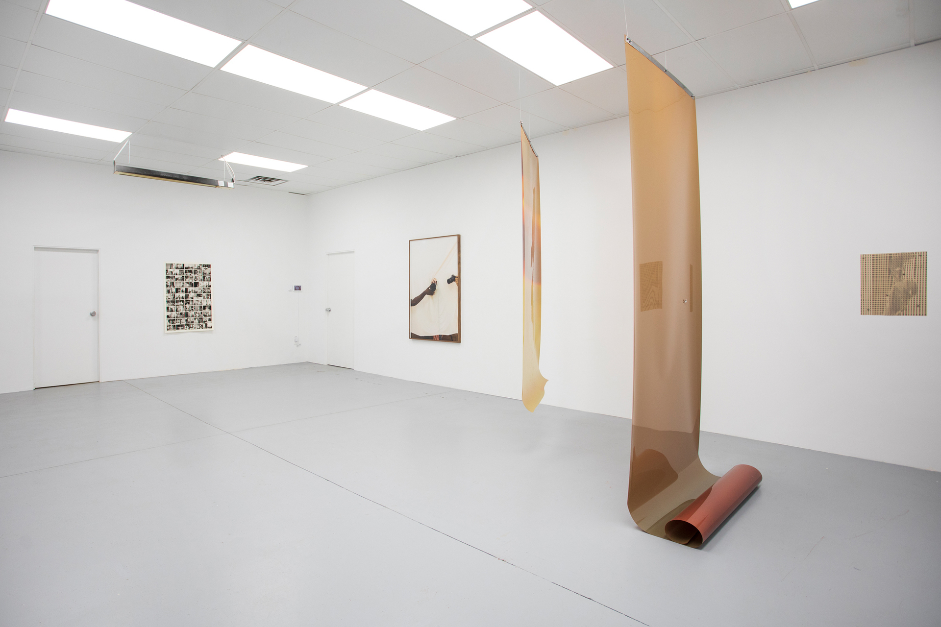 New works by Timothy Yanick Hunter consider both digital and physical interpolations around image making, using forms of looping, rhythm, and repetition. Embracing disorientation and opacity, he poses questions about the familiar, and challenges viewers to imagine futures beyond our context. In a related dialogue, Moyra Davey’s work attempts to bridge unseen gaps between culture and lived experiences. Her works often possess visible creases and tape marks, after physically sending them through mail systems. She is interested in witnessing the flow and chance related to letting something go, and observing the results. Laurie Kang shares Davey’s interest in precarity, as her practice engages directly in the ‘misuse’ of photographic materials. In her series Molt, she suspends large, unfixed film from the ceilings, allowing them to tan continually over time. The context in which the film is exposed will leave impressions on the sensitive surface of the materials, like a body, telling atmospheric stories about their context.