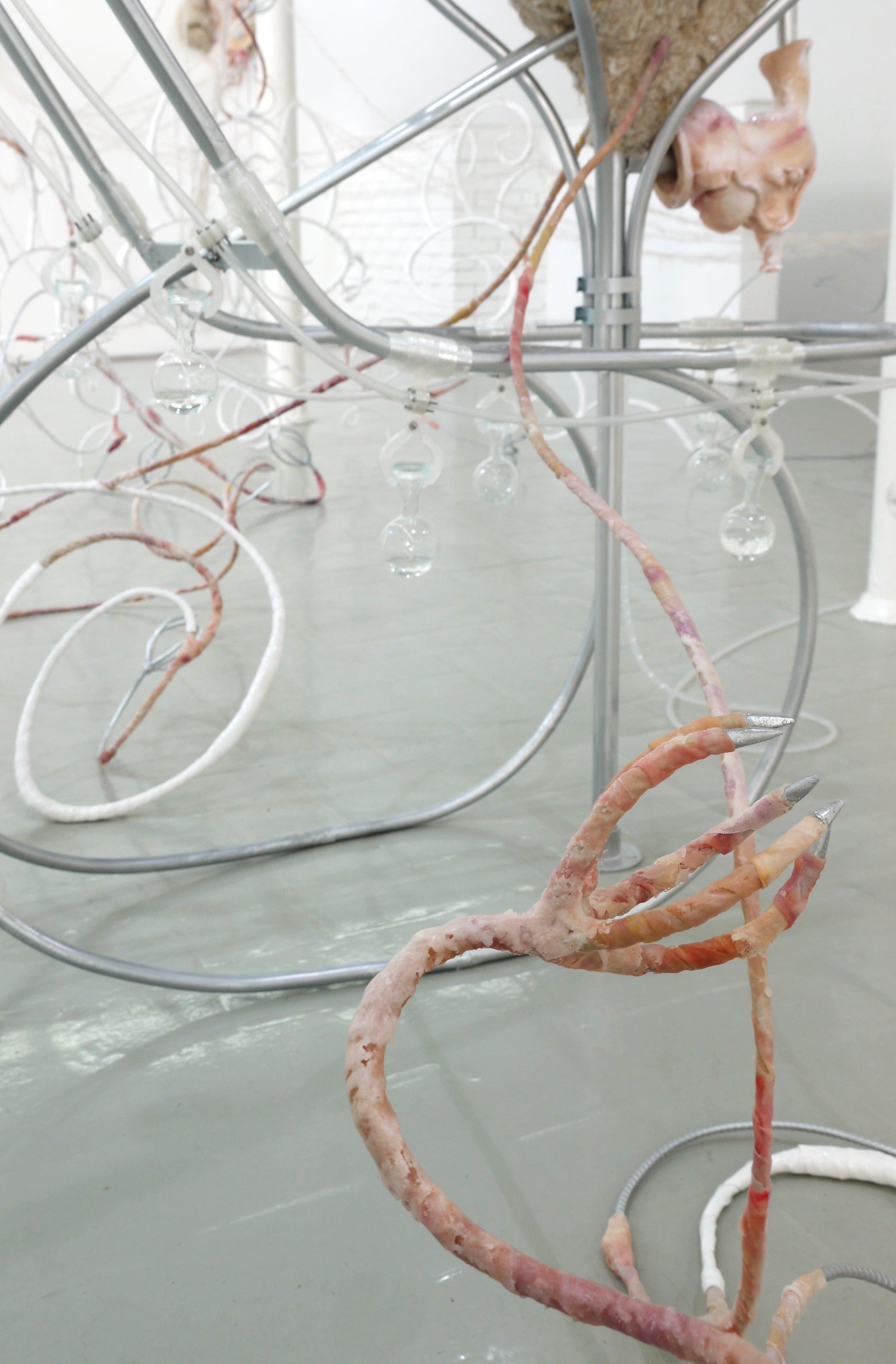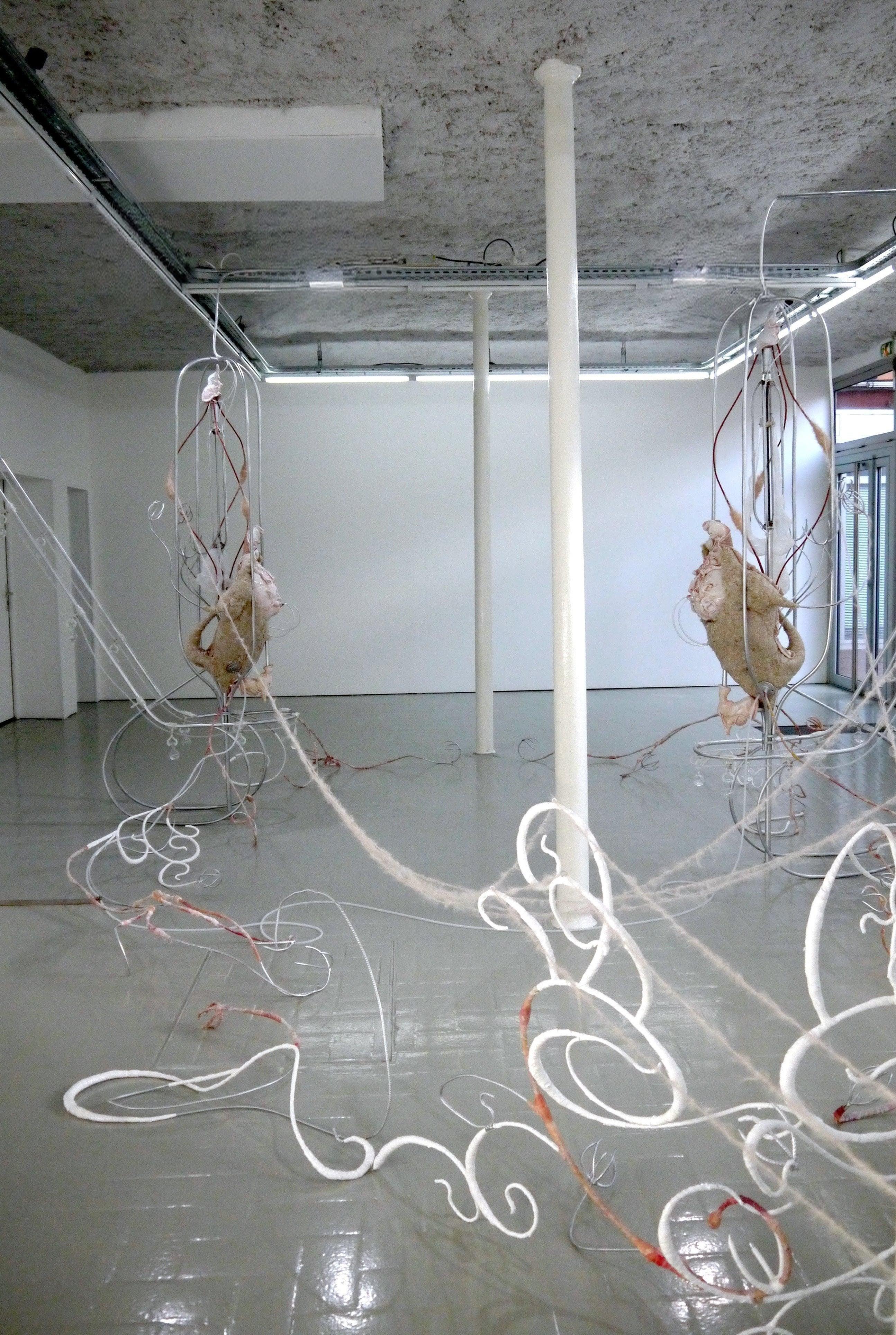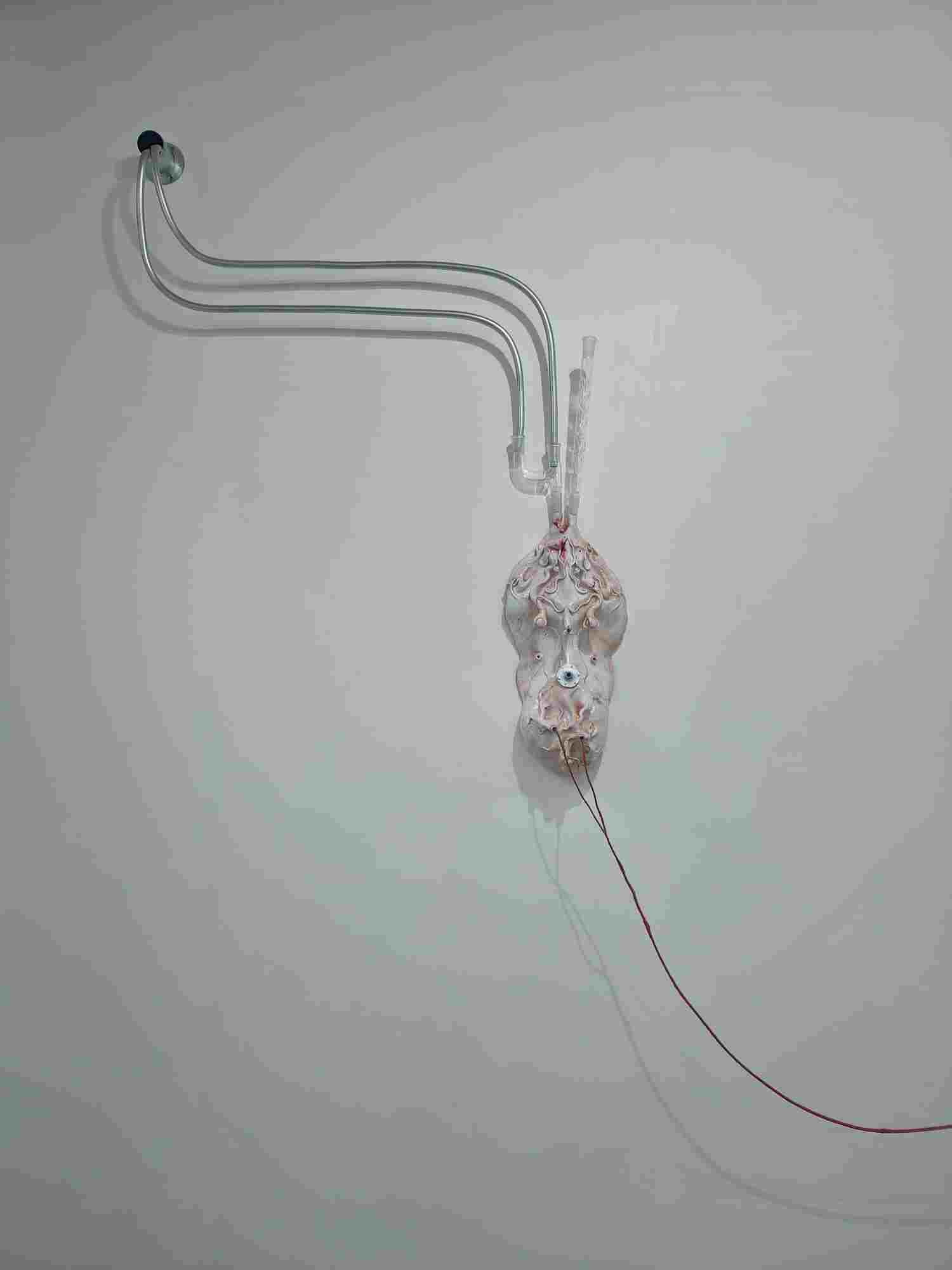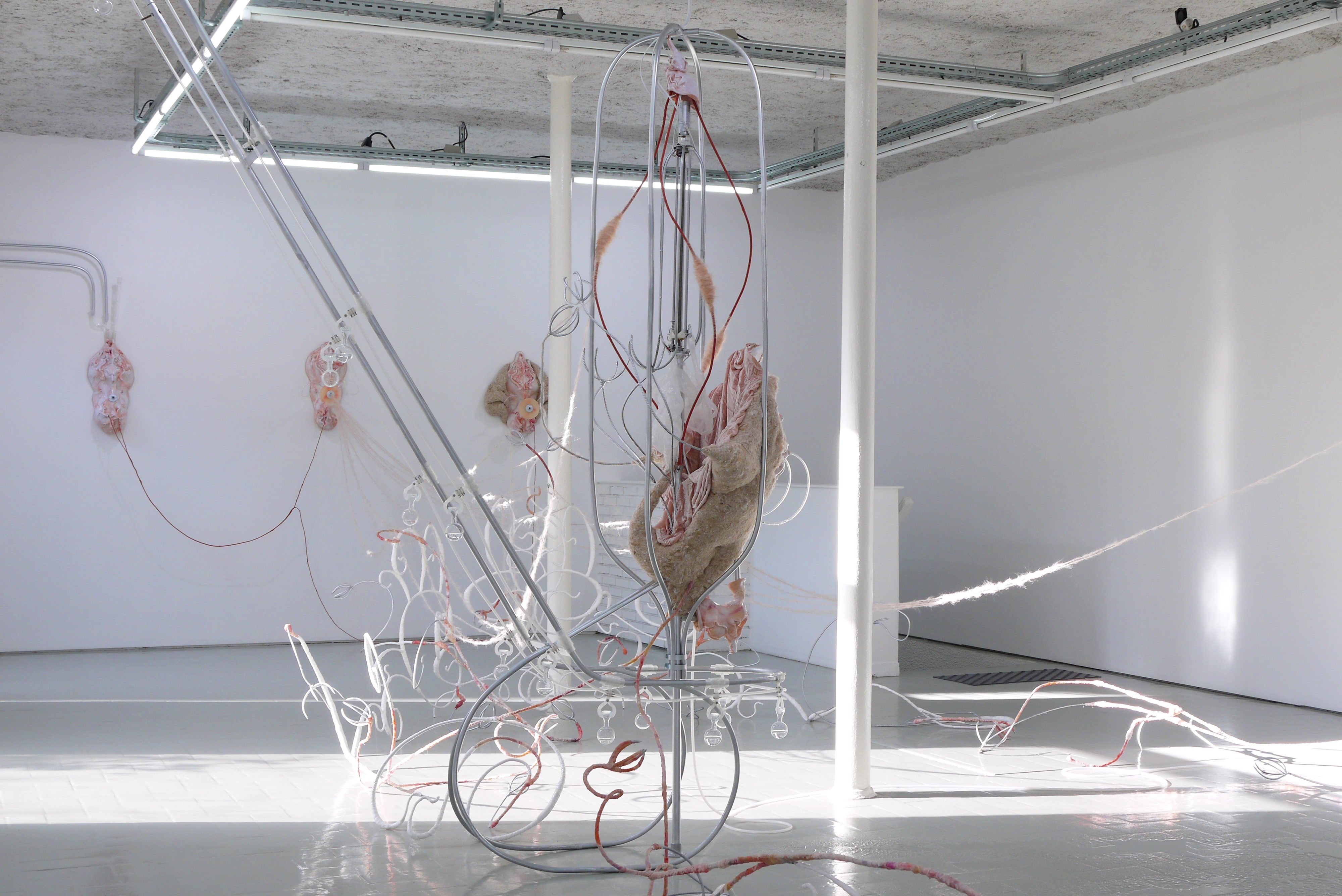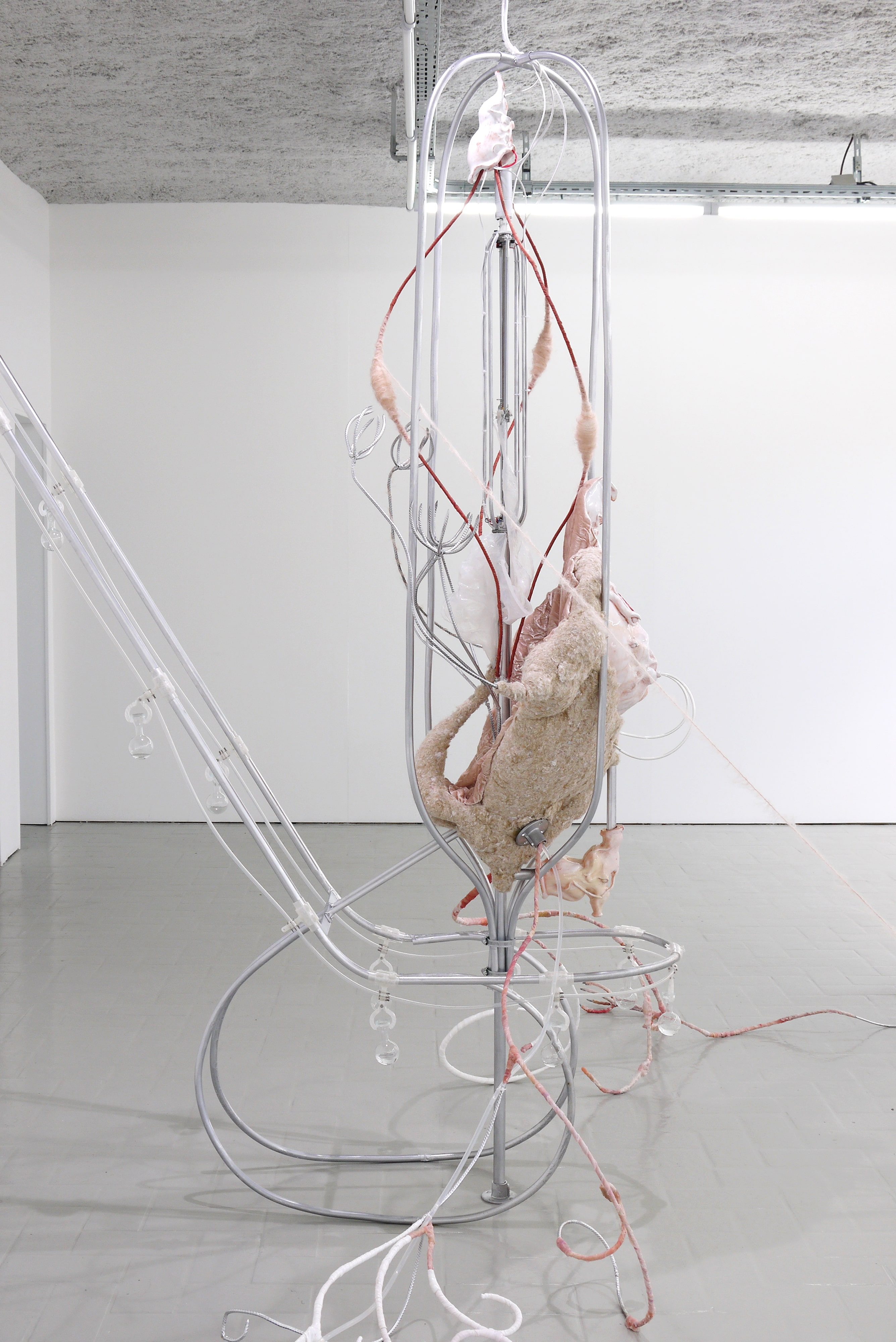 "AnaĂŻs Gauthier's immersive installations simulate life that stubbornly persists in the face of failure. She creates all kinds of chain reactions within a paradoxical ecosystem where the organic and the mechanical merge without ever quite managing to come to terms with each other. Exhaustion is symptomatic of this mutual rejection. Yet these technological reliquaries and autoimmune forms depend on each other. Connected, wired, intubated, they are linked by a makeshift system that keeps them in a state of mutual motor and emotional distress. This invasive apparatus forces them to share everything: the resources they generate as well as those they excrete. Limited, does this body-machine have any choice but to resist? "