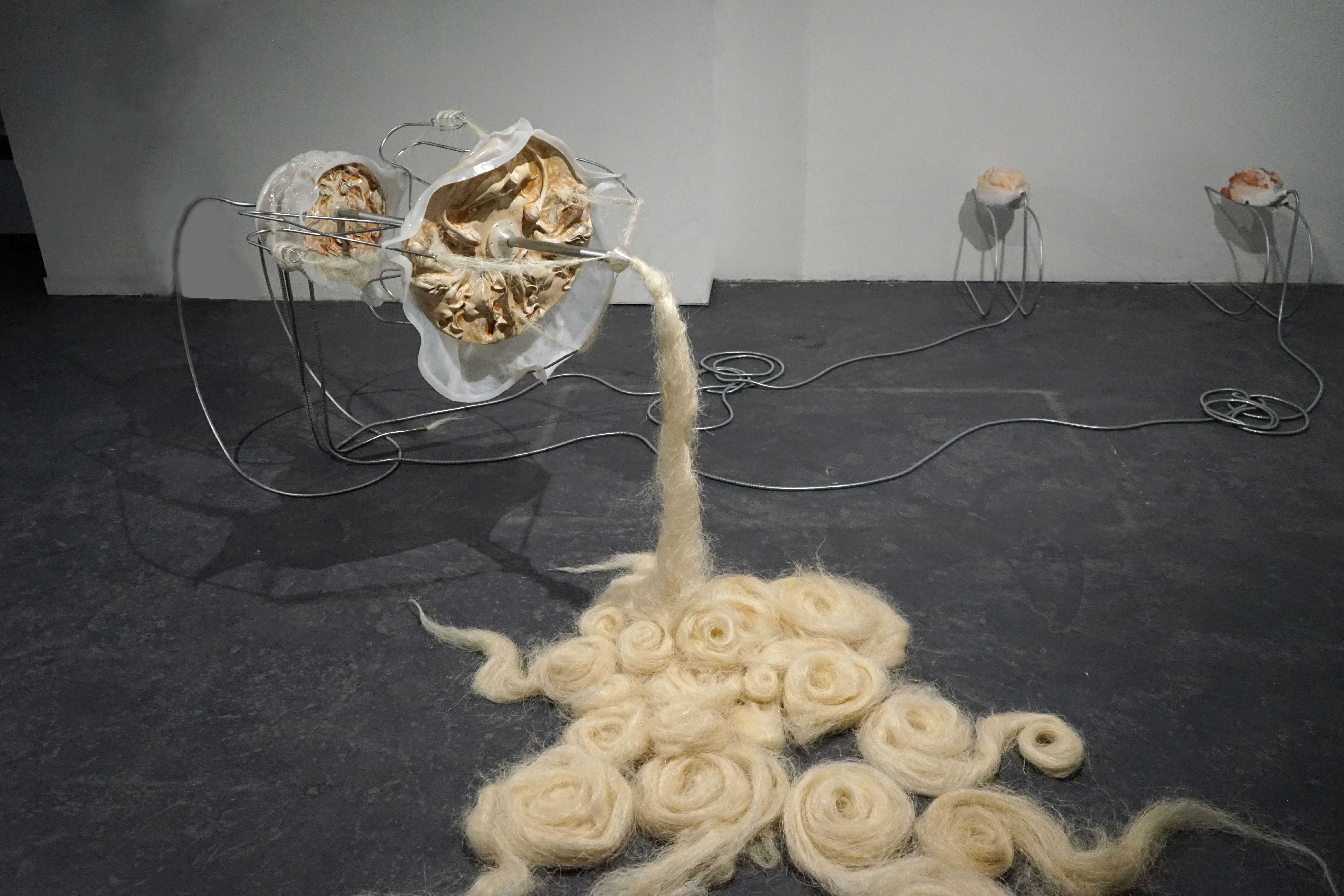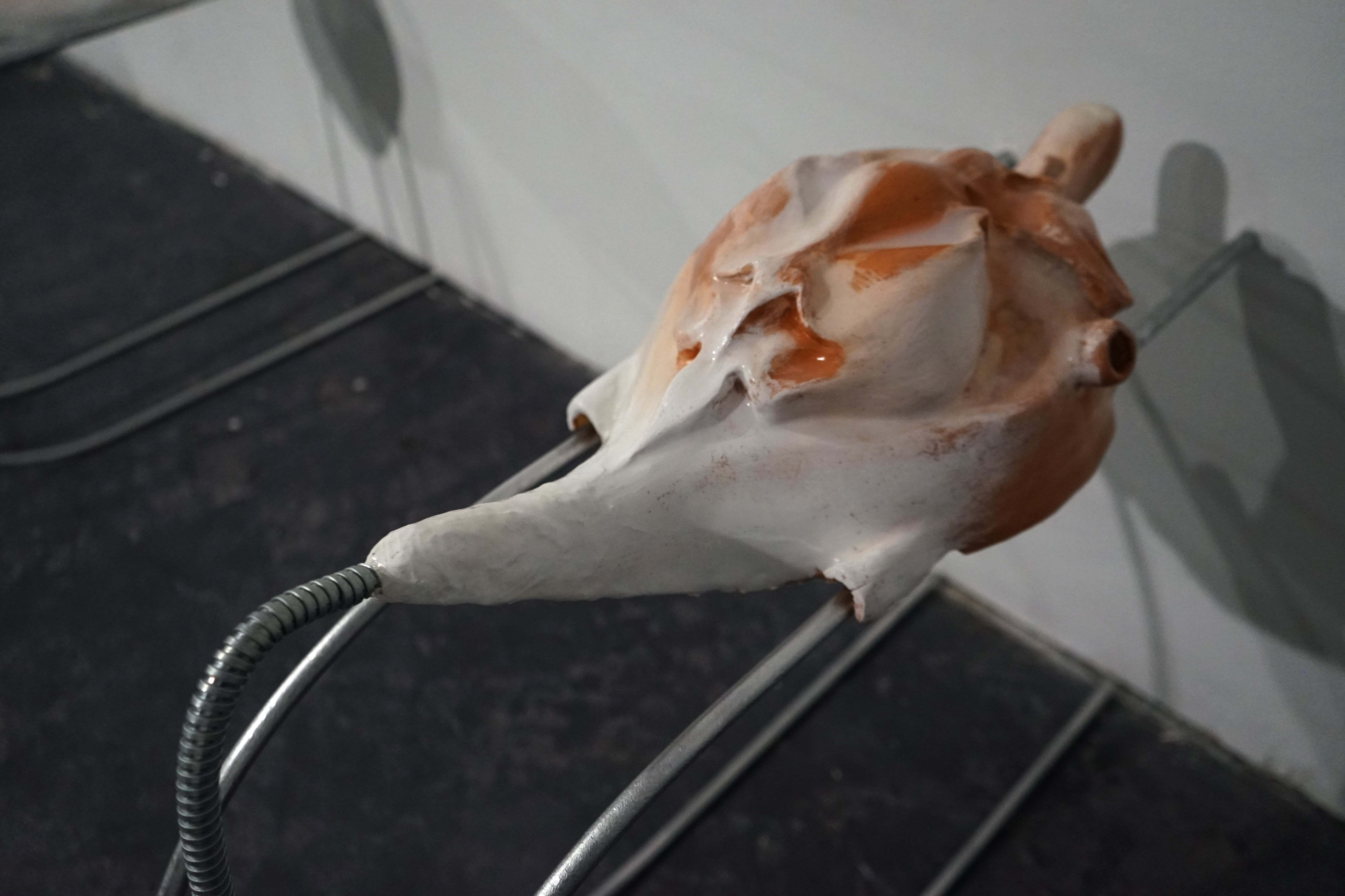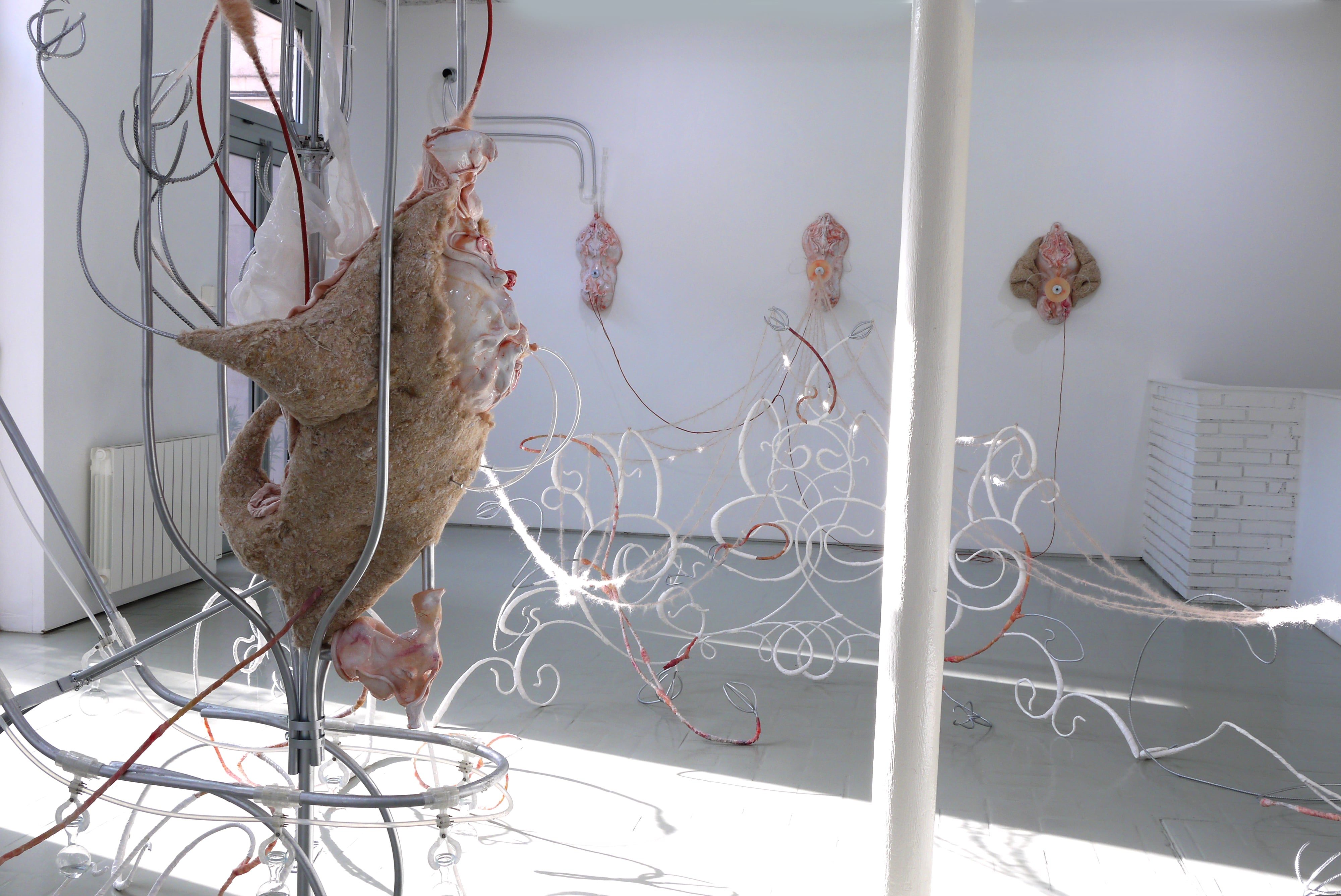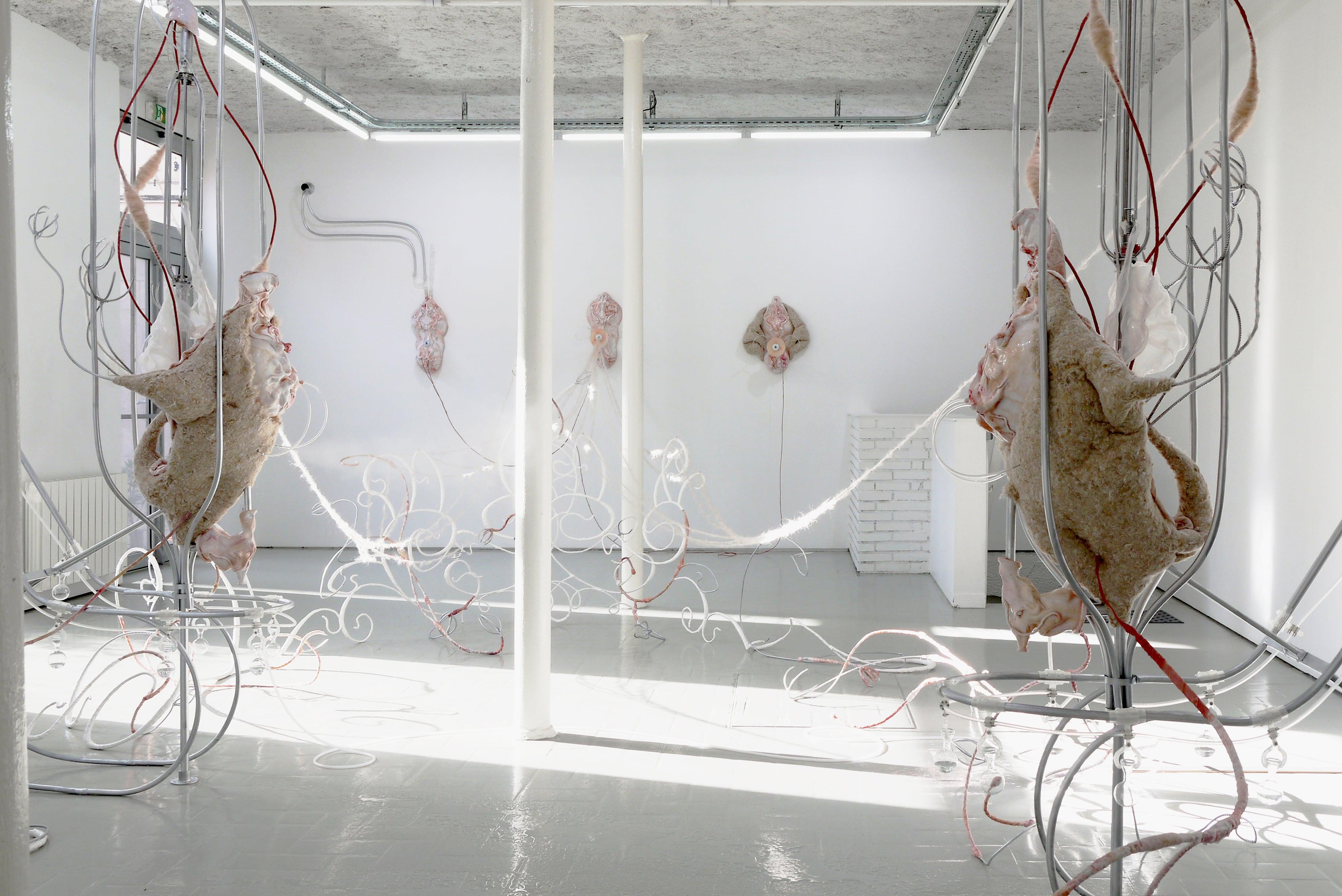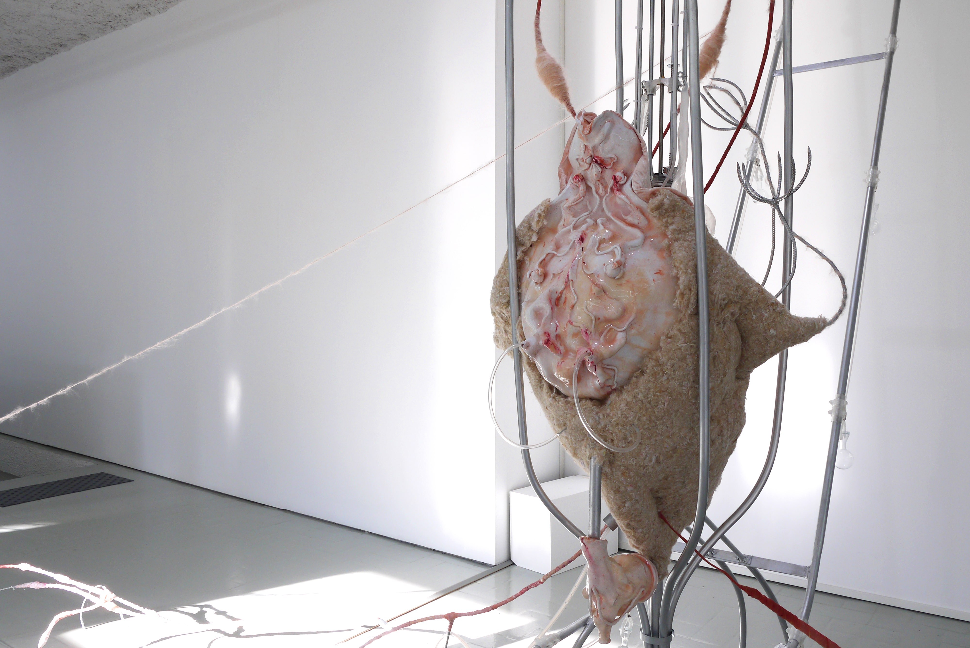 "AnaĂŻs Gauthier's immersive installations simulate life that stubbornly persists in the face of failure. She creates all kinds of chain reactions within a paradoxical ecosystem where the organic and the mechanical merge without ever quite managing to come to terms with each other. Exhaustion is symptomatic of this mutual rejection. Yet these technological reliquaries and autoimmune forms depend on each other. Connected, wired, intubated, they are linked by a makeshift system that keeps them in a state of mutual motor and emotional distress. This invasive apparatus forces them to share everything: the resources they generate as well as those they excrete. Limited, does this body-machine have any choice but to resist? "