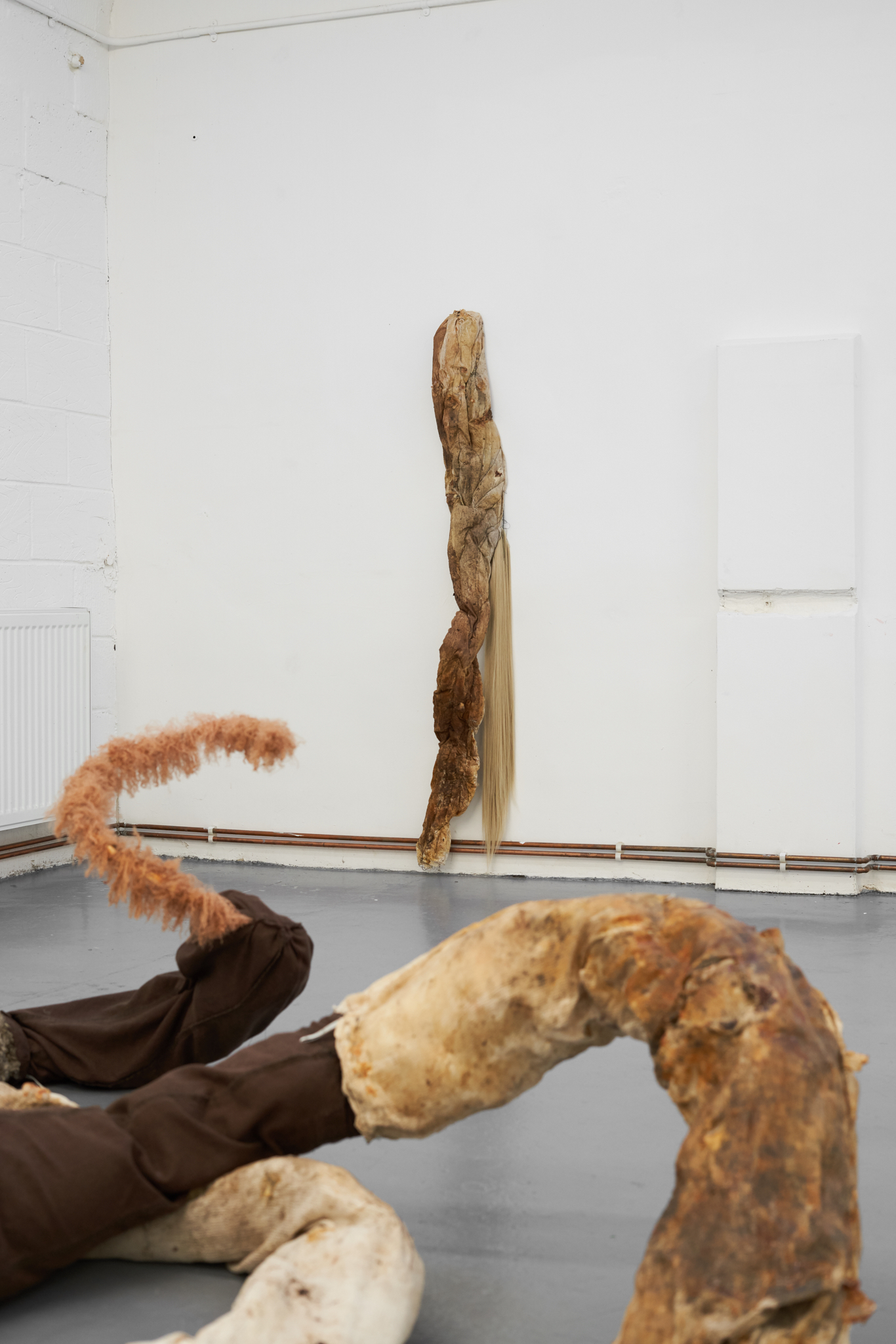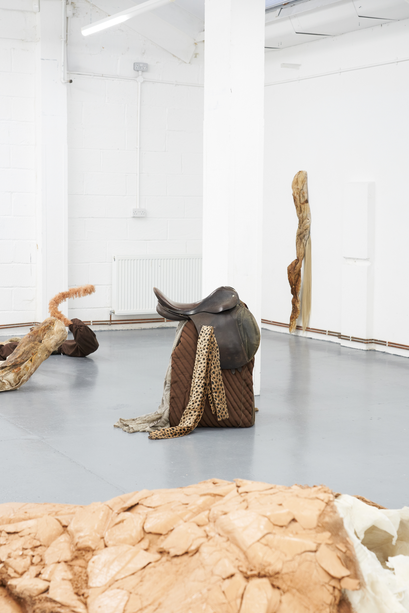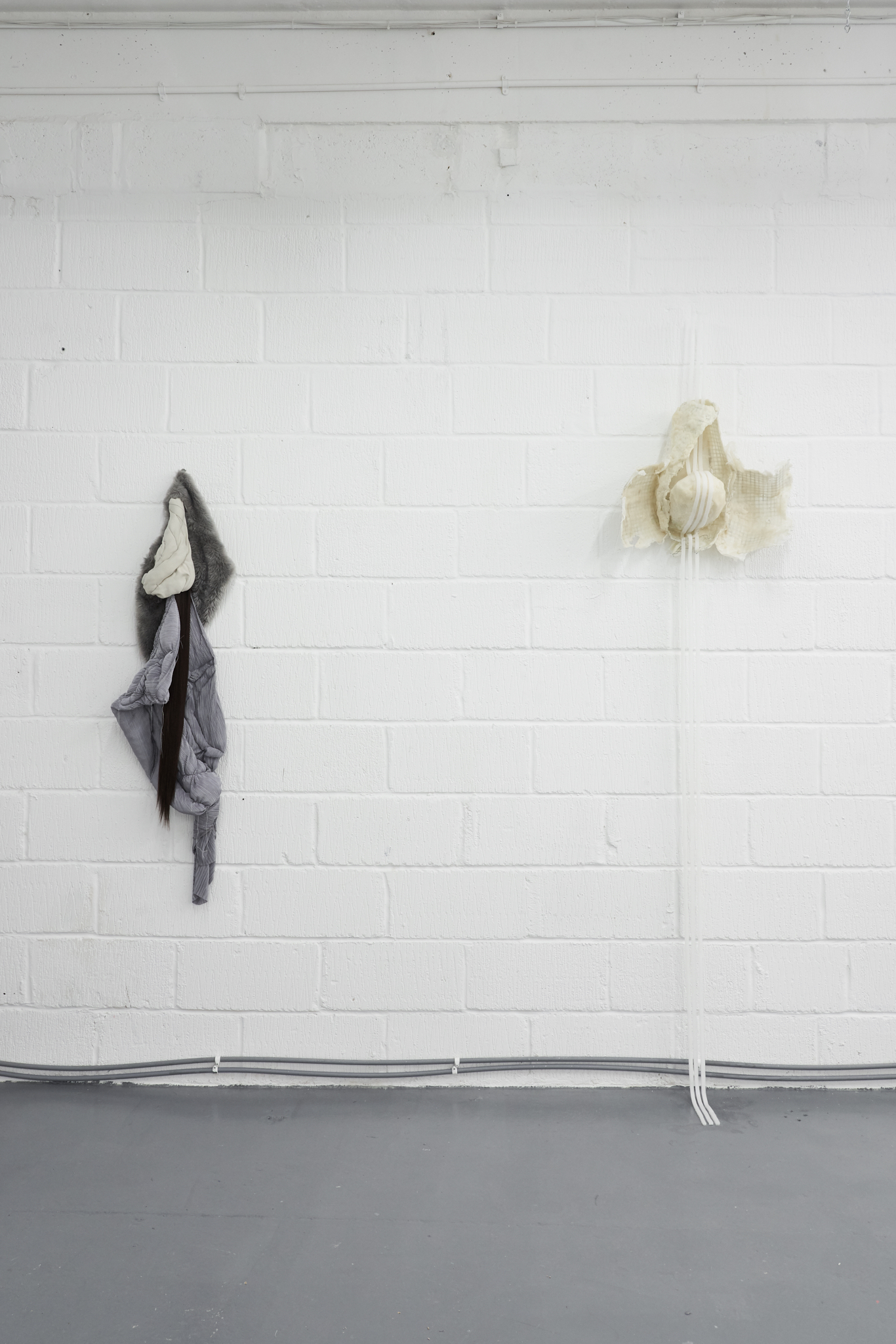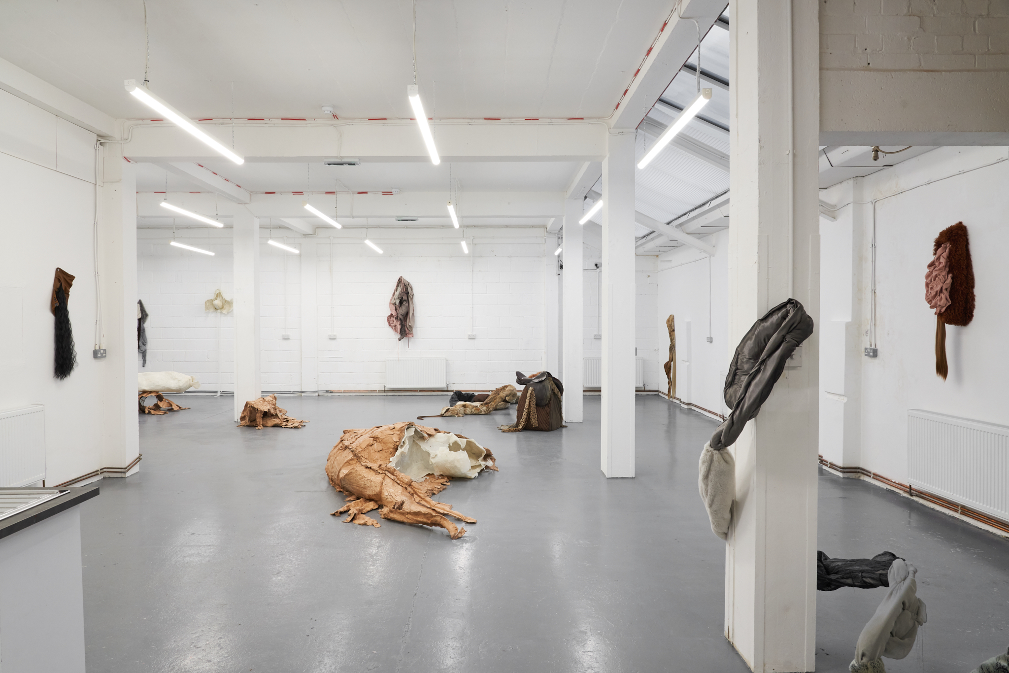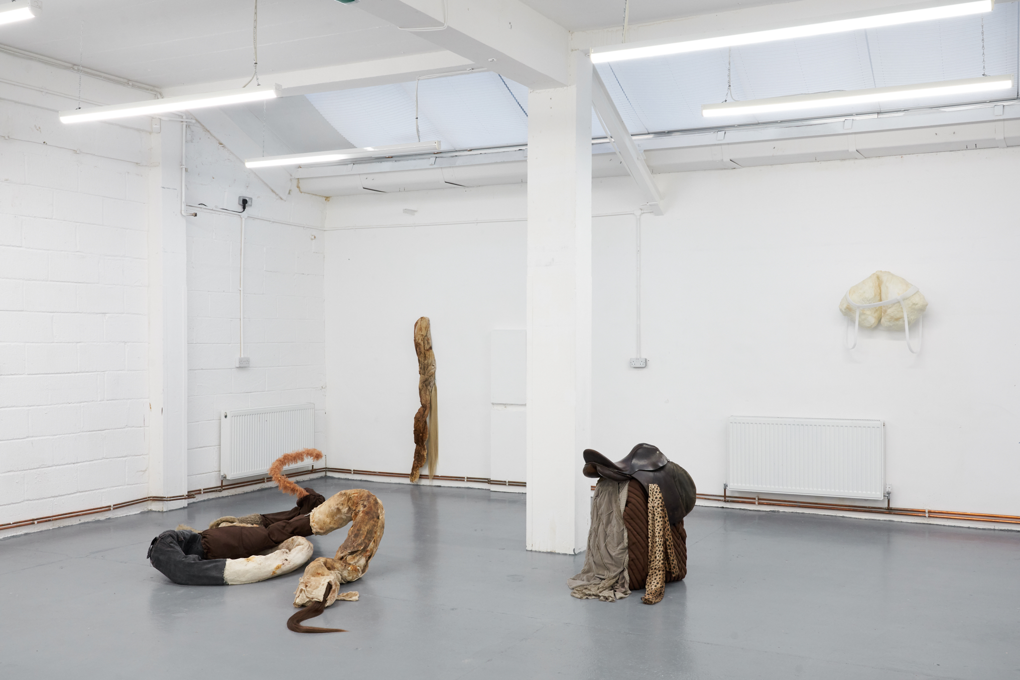 To Lure, to Hunt, to Catch is an exhibition by Valentino Vannini and Joanna Wierzbicka curated by Sophie Nowakowska that explores power, seduction, and bodily display. Drawing on animal tails and historical garments such as codpieces, the exhibition explores how bodies communicate dominance, vulnerability, and desire, and how function becomes exaggeration. Elements such as padding, straps, and harnesses appear as cultural symbols of control, sexuality, and display.