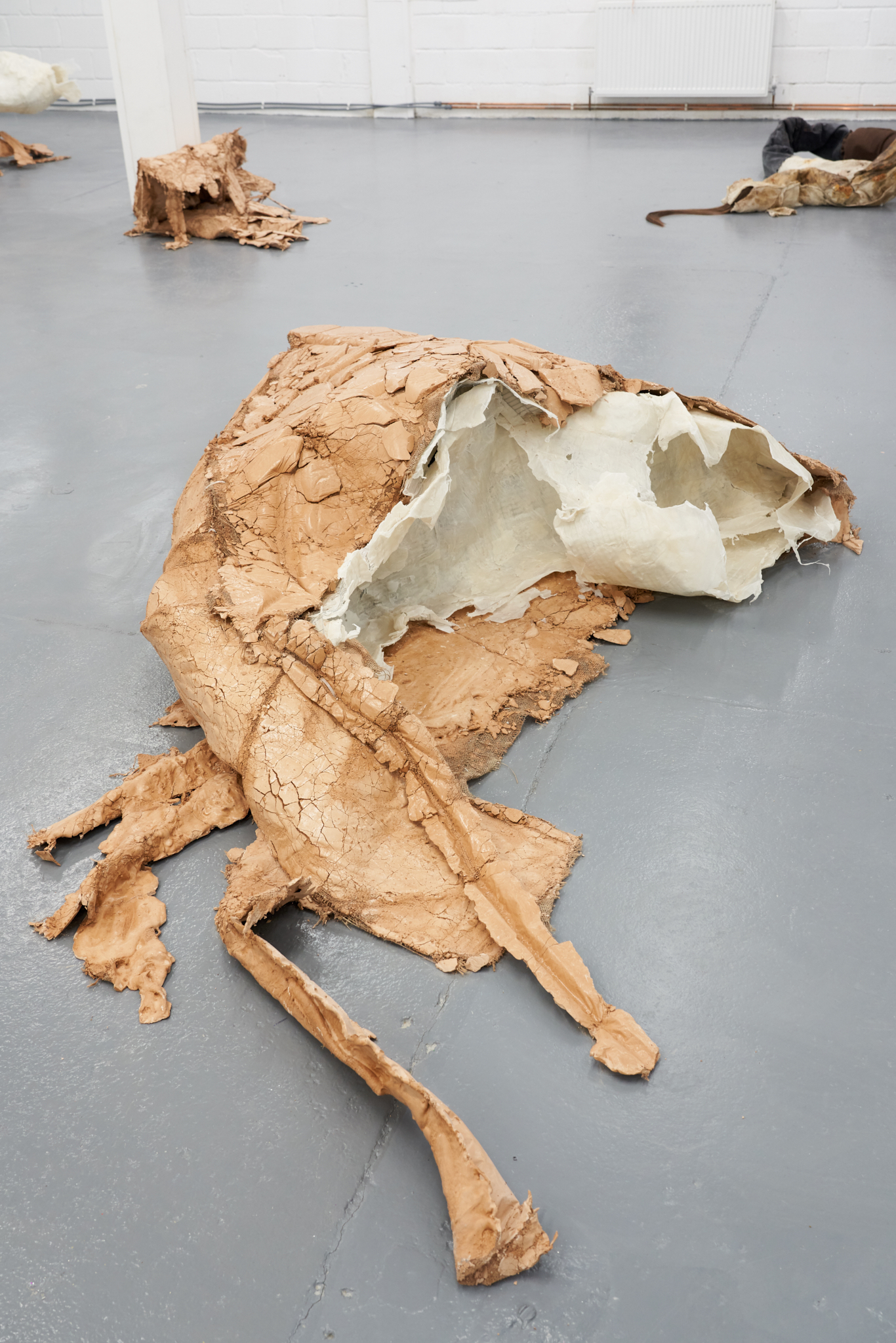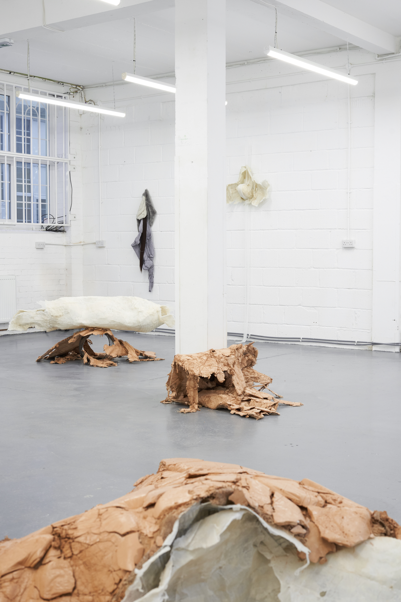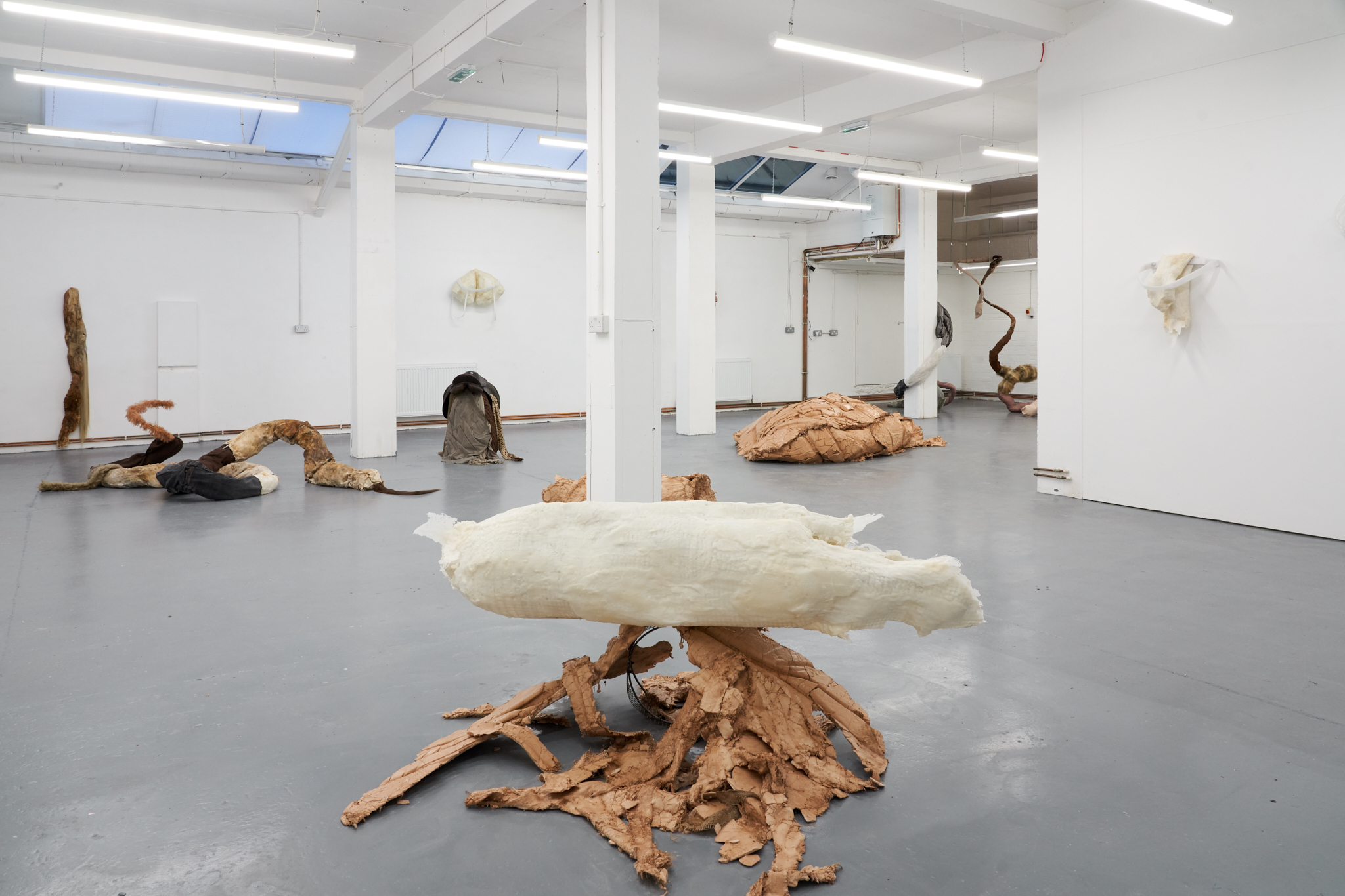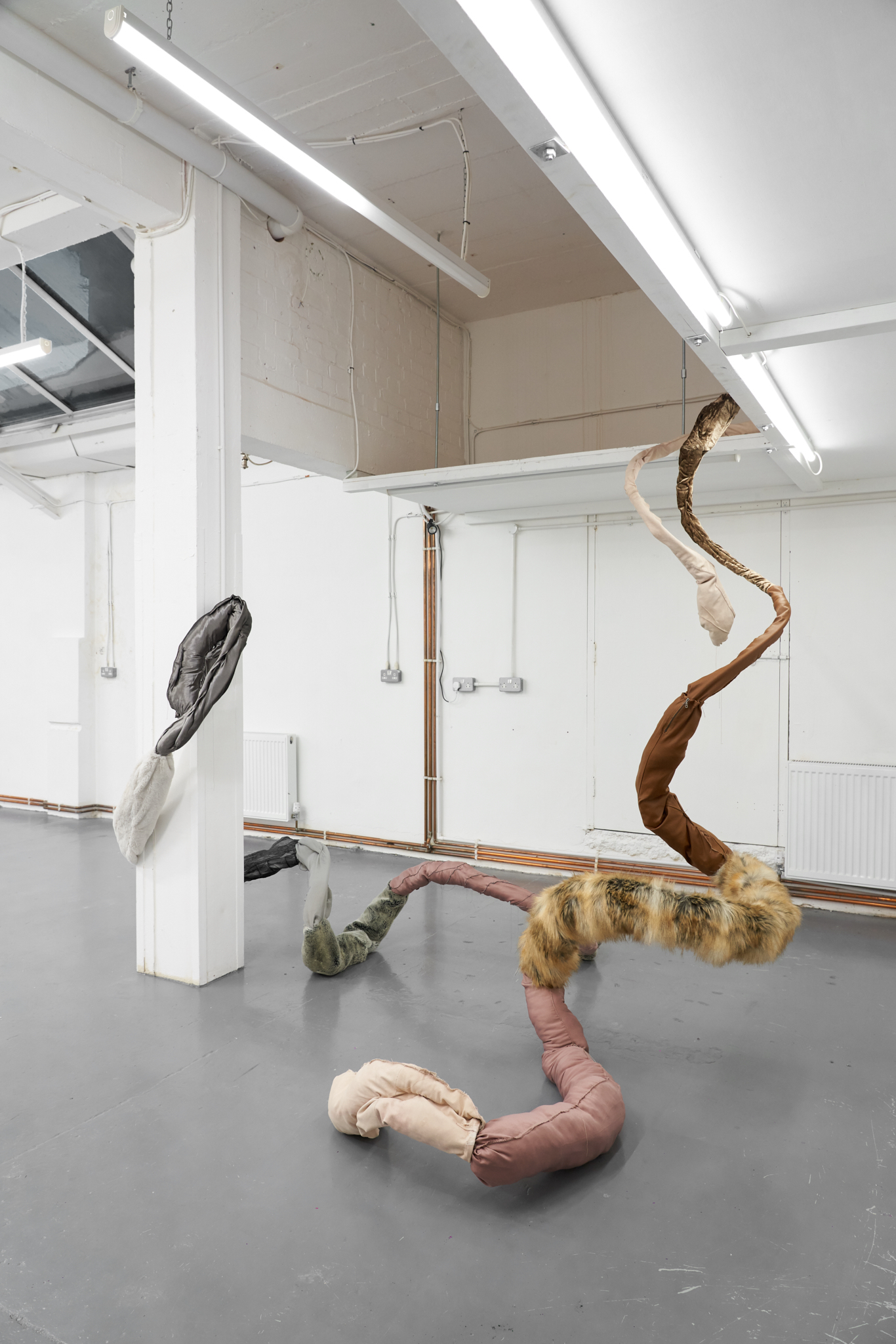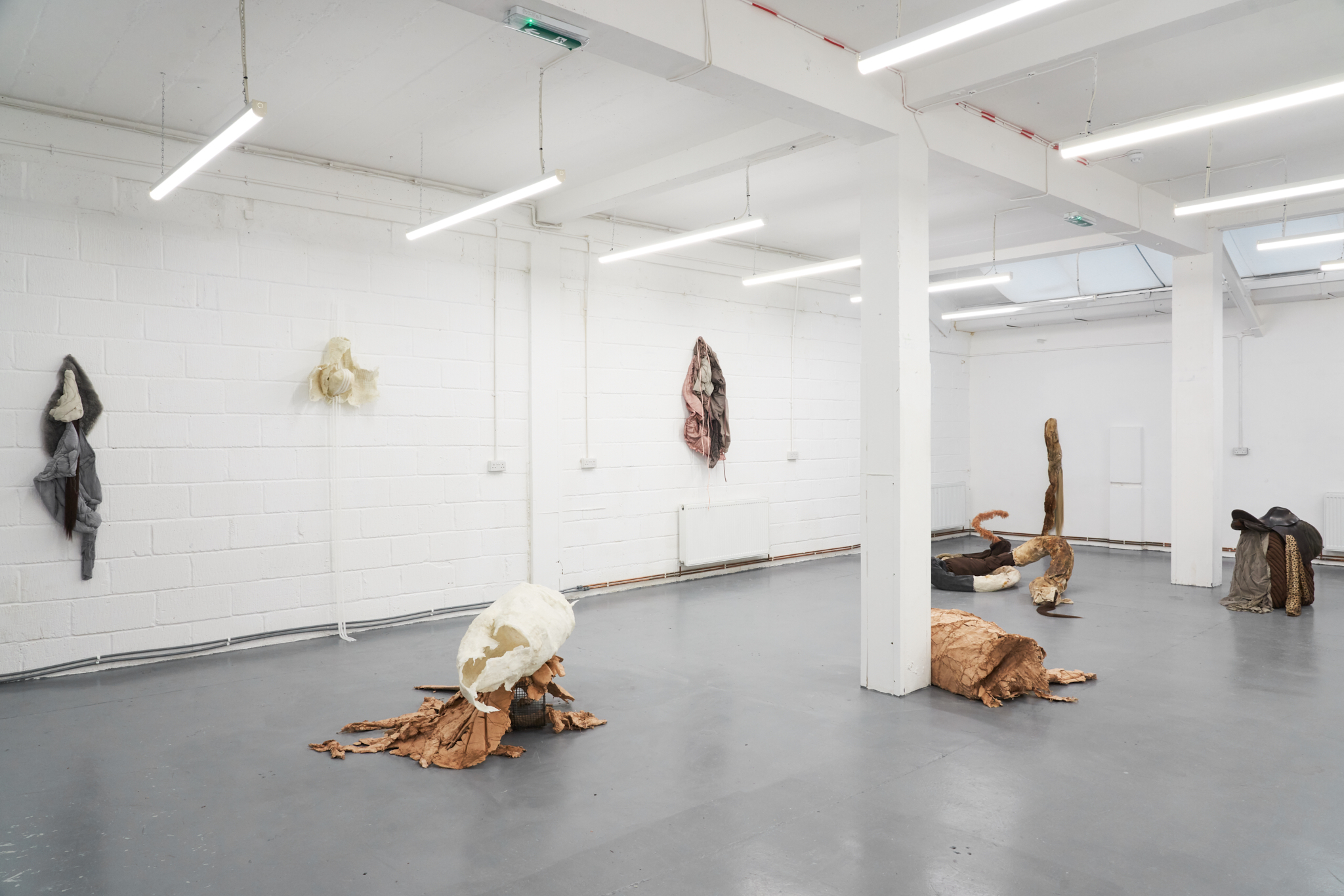 To Lure, to Hunt, to Catch is an exhibition by Valentino Vannini and Joanna Wierzbicka curated by Sophie Nowakowska that explores power, seduction, and bodily display. Drawing on animal tails and historical garments such as codpieces, the exhibition explores how bodies communicate dominance, vulnerability, and desire, and how function becomes exaggeration. Elements such as padding, straps, and harnesses appear as cultural symbols of control, sexuality, and display.