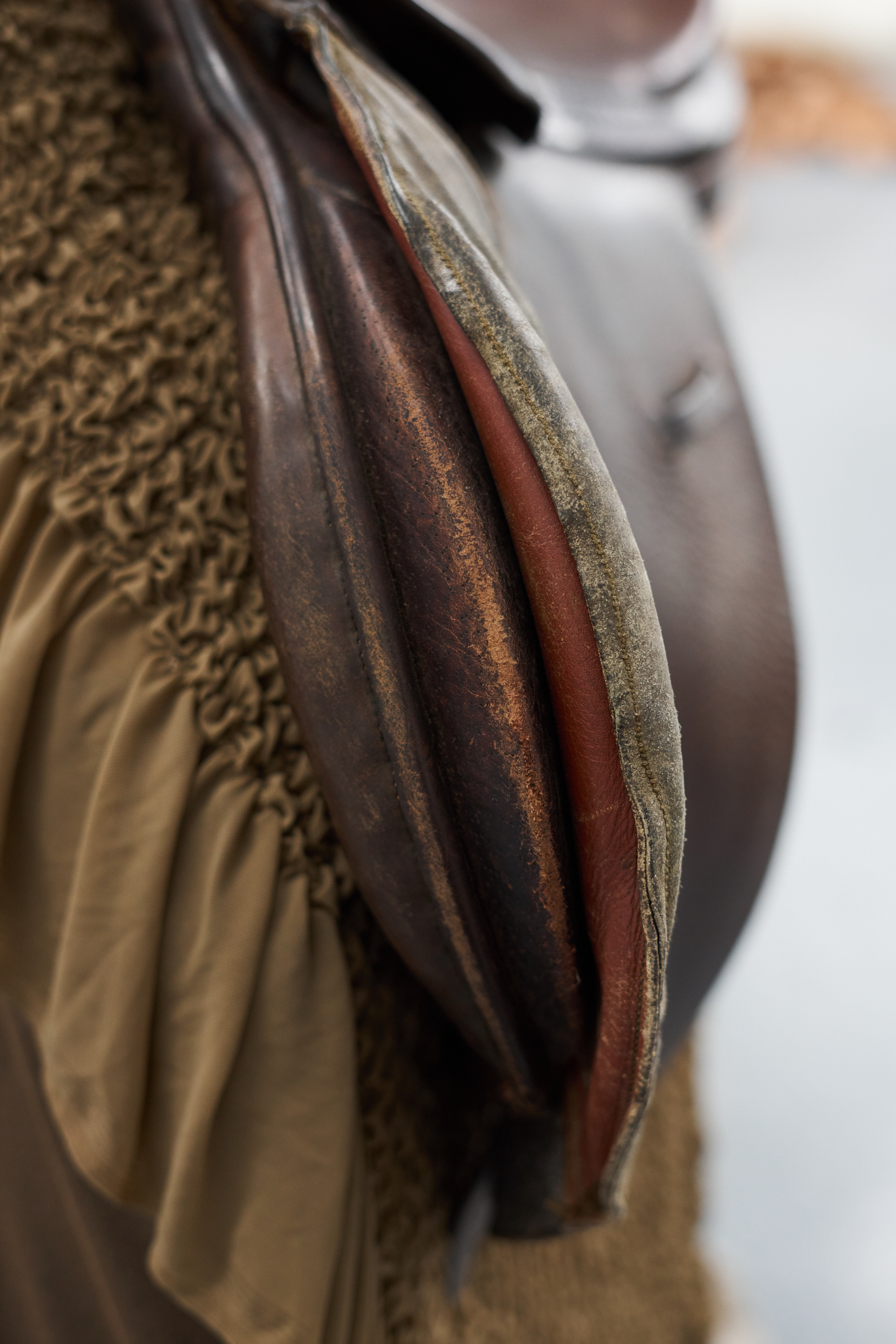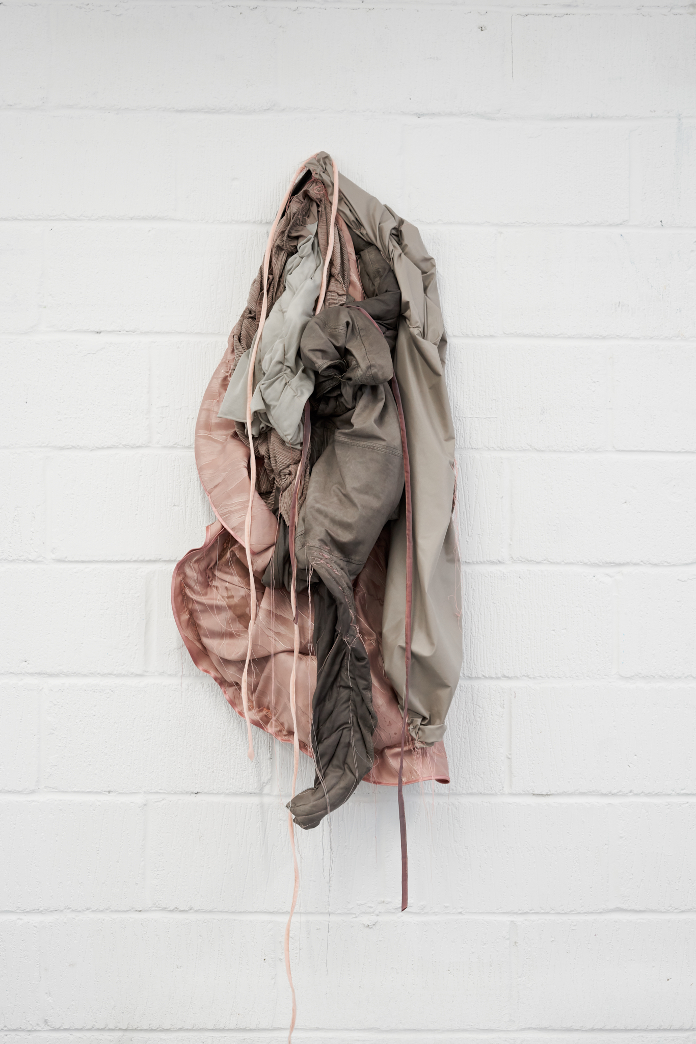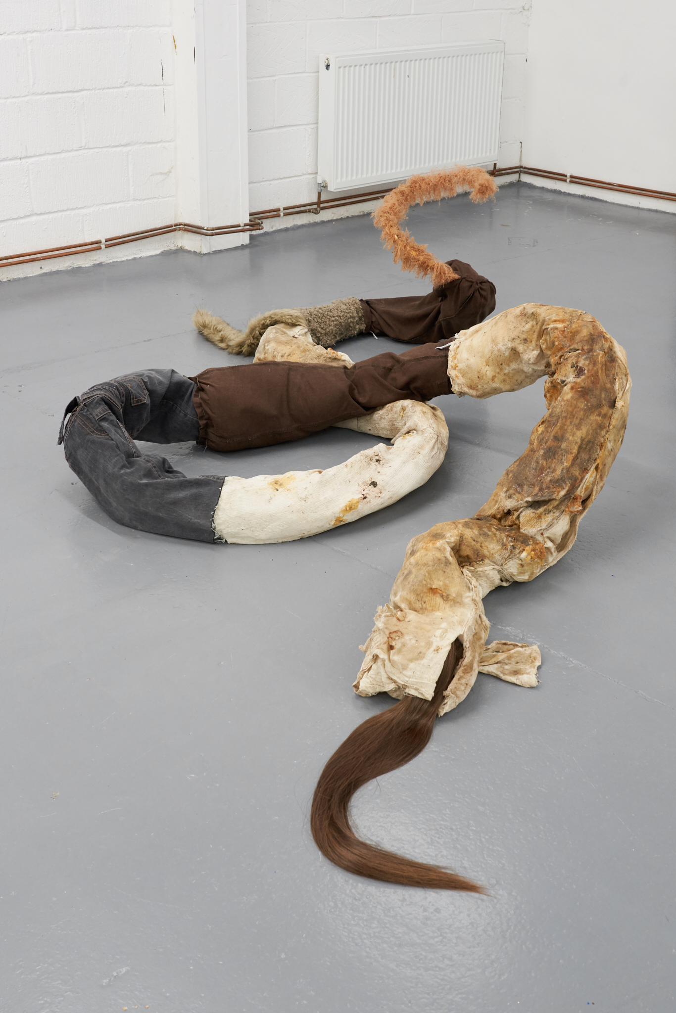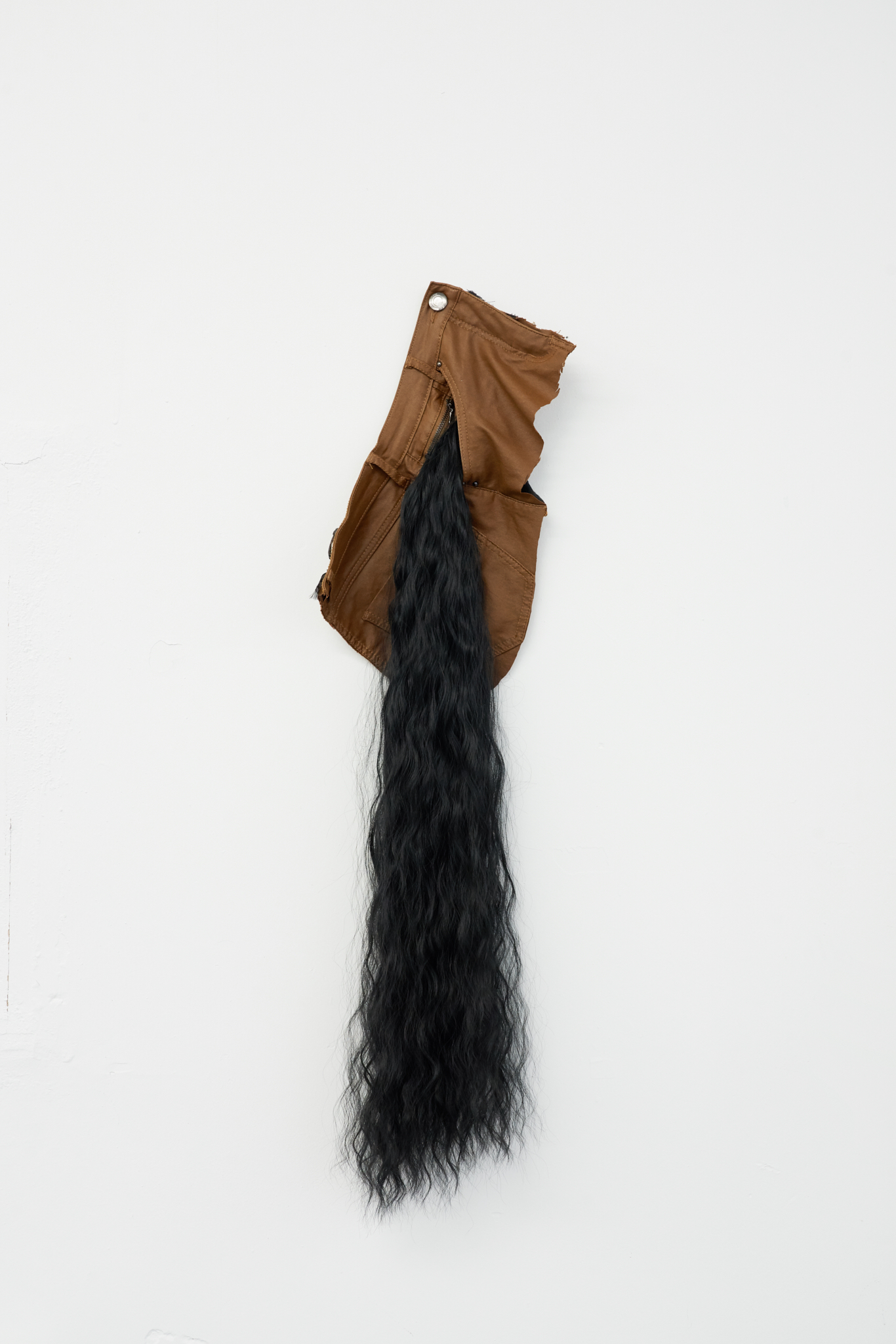 The installation takes cues from the atmosphere of a masquerade ball, where attraction and power are unstable and constantly shifting. Joanna Wierzbicka’s tails suggest a half-human, half-animal figure that resists fixed categories. The tail becomes a sensory extension of the body, linked to instinct, wildness, and the often-overlooked back of the body. Working with dyed fabrics, second-hand clothing, wigs, and horse-riding equipment, she brings what is usually hidden into focus.