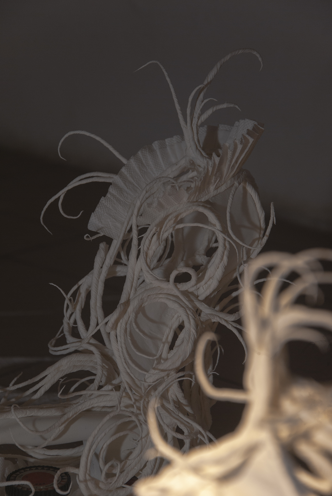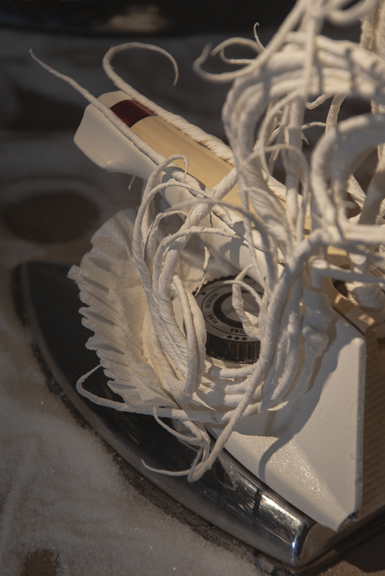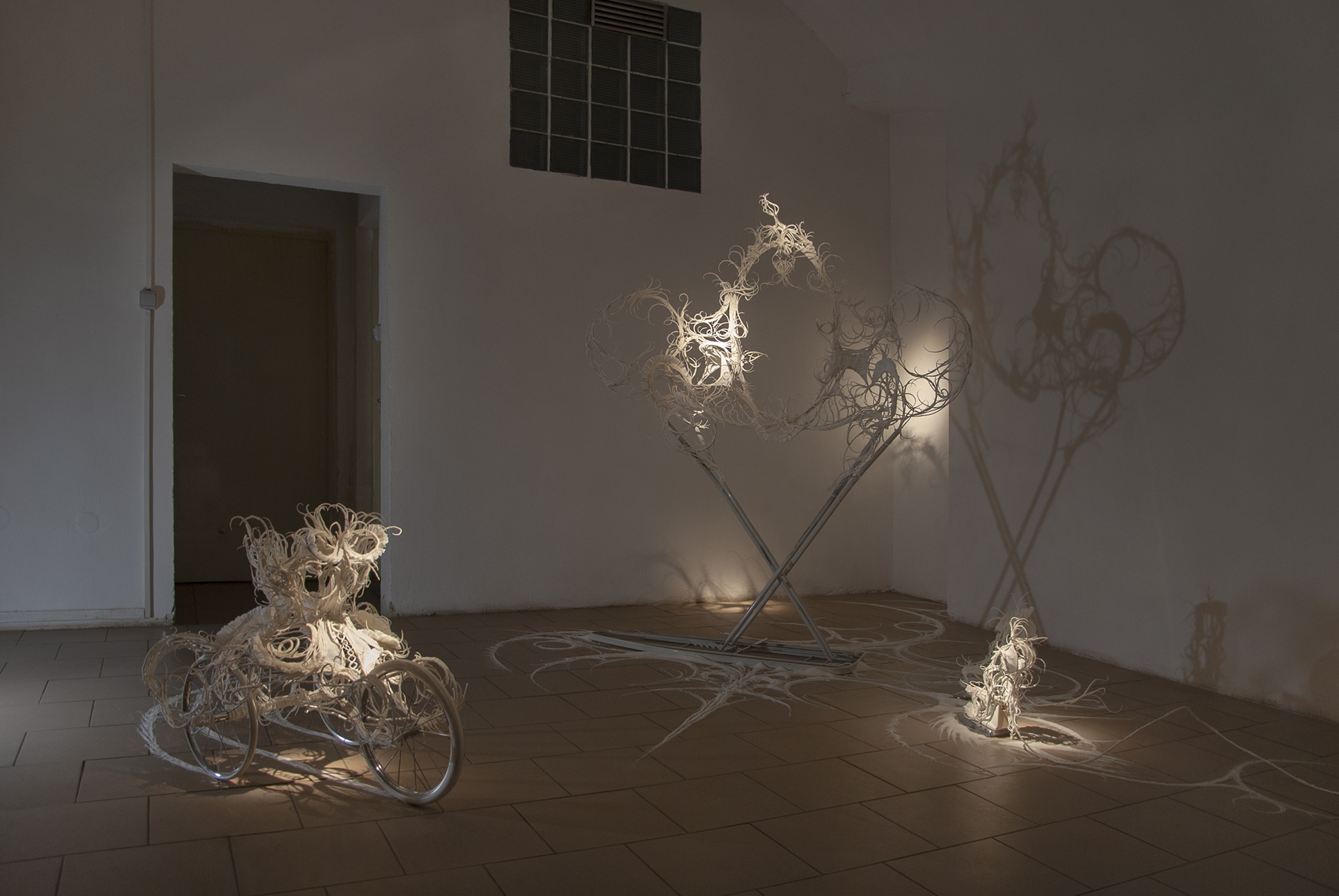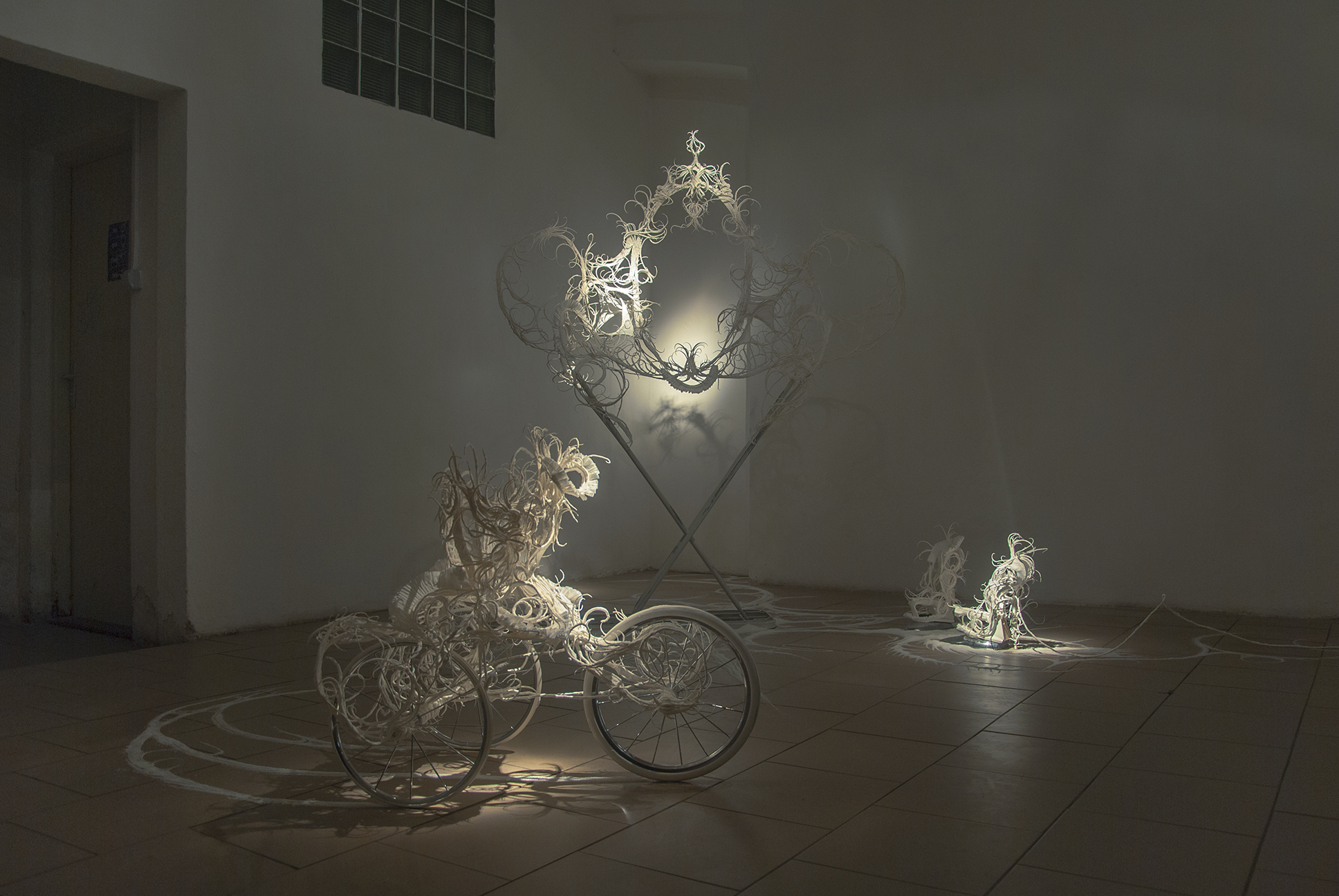 The desire for premium and luxury goods clashes with the reality experienced by Pavol Godiška, a recent art school graduate, as well as in the lives of countless other precarious individuals around the world, who face low personal economic capacity and material security. However, Godiška accepts these limitations and incorporates them into his work as the conceptual framework for his own artistic practice. What cannot be bought must be made. What cannot be afforded must be replaced with something else. Godiška replaces the perfect surfaces and precisely cut shapes of expensive, high-end materials with the most affordable ones possible. For example, in an older work, he used instant noodles as the source material for a replica of the iconic Birkin bag, the leather original of which, depending on the edition, ranges in price from tens to hundreds of thousands of euros. The result of this experiment, which in verbal description may sound like a comical DIY experiment in the vein of classics of the genre such as Jirka Babica or Láďa Hruška, is a surprisingly fragile, intimate, and sensitive work. Pavol Godiška achieves a similarly delicate result in a series of objects exhibited at Zaazrak|Dornych. This time, however, the mirror, high-heels, and corset are made of paper tissues, which grow out of ready-made household items as a representation of reality, in which the triviality of everyday home activities is replaced by uniqueness and beauty. In this peculiar still life, similar to those created by random constellations of clothes scattered around a room among furniture and other objects, themes of intimacy, ephemerality, personal identity, queerness, and subliminal criticism of capitalism are met thanks to sensitive handiwork and equally sensitively chosen materials. Thanks to its conceptual and craftsmanship quality, what began as a low-cost attempt to imitate an unattainable object ultimately describes an imaginary circle—and becomes a luxurious object of art.
