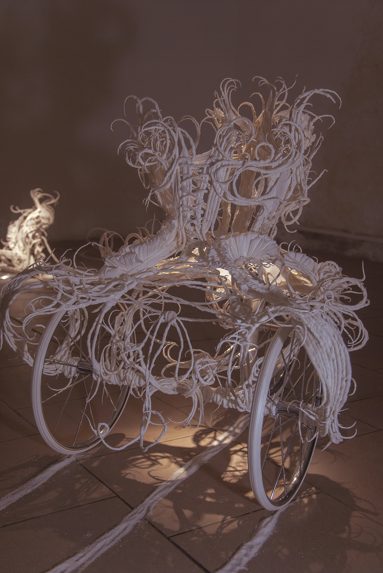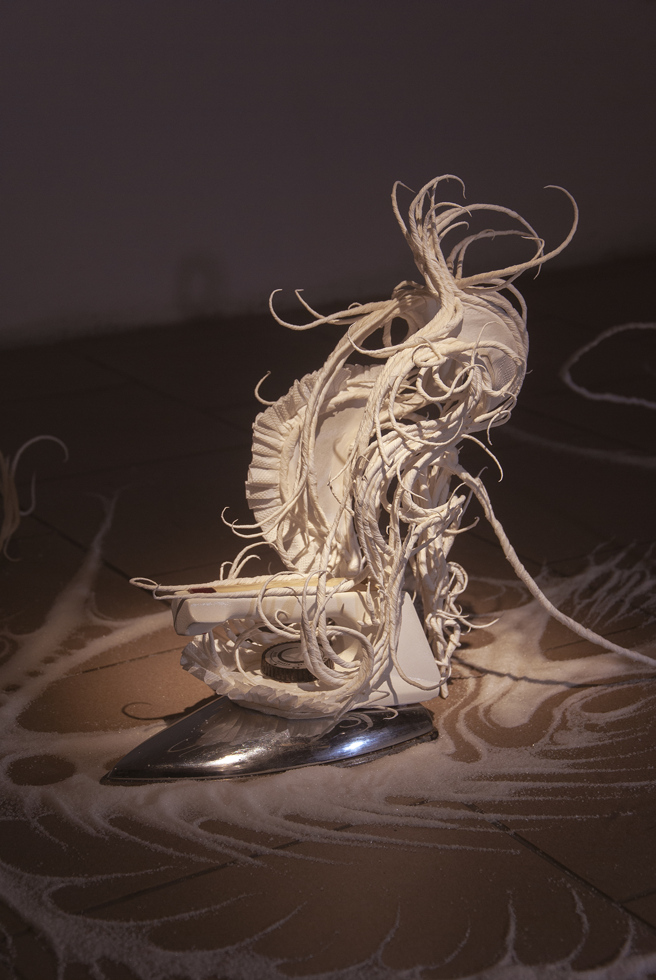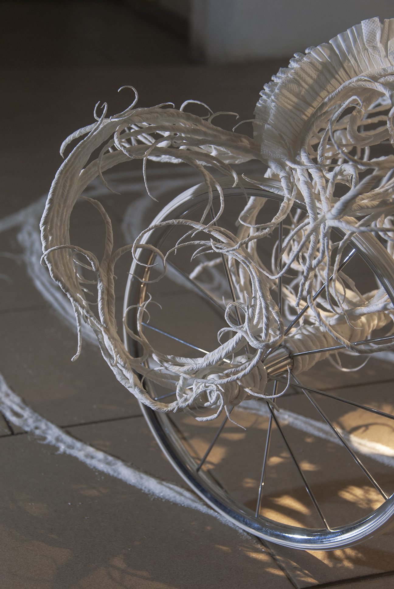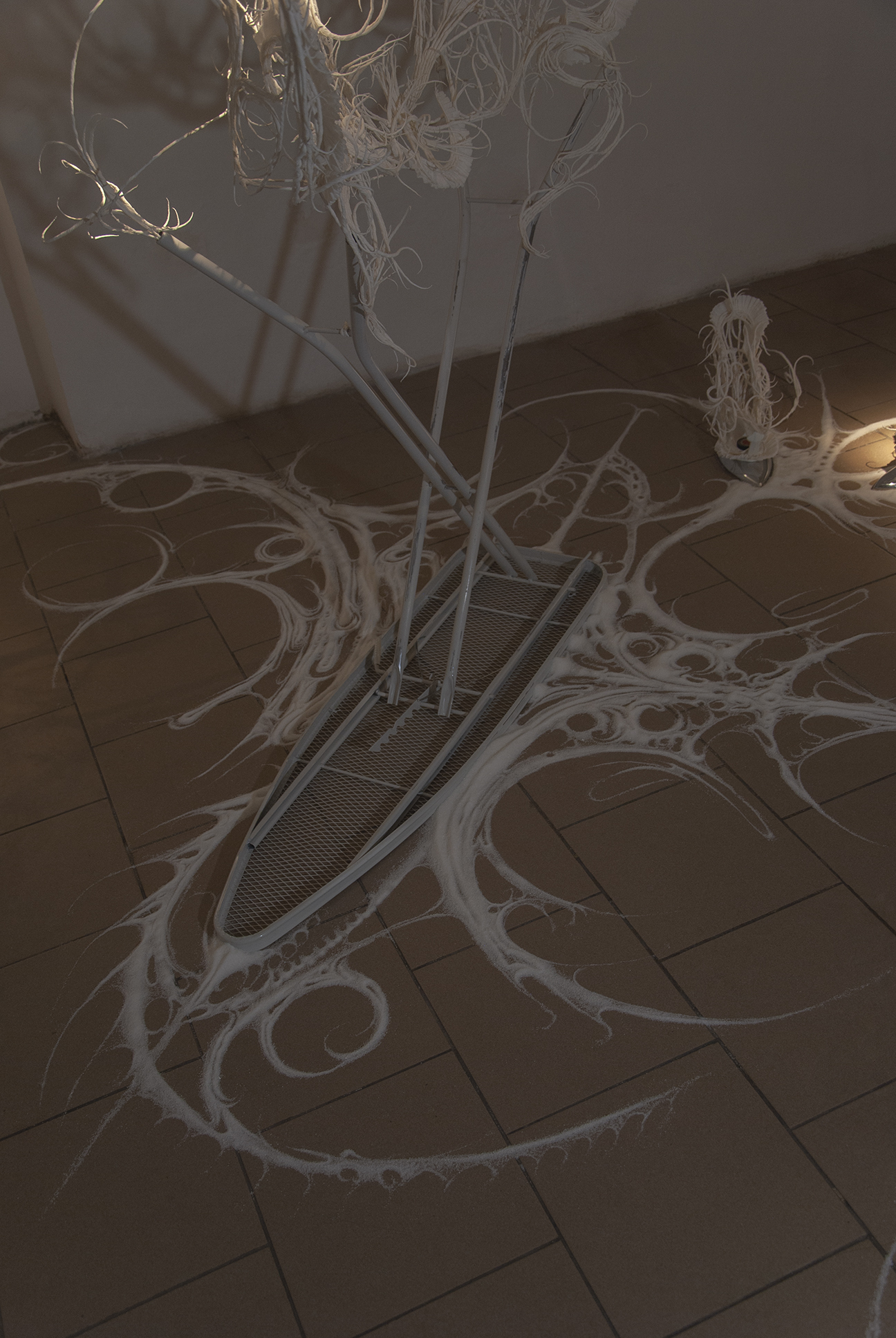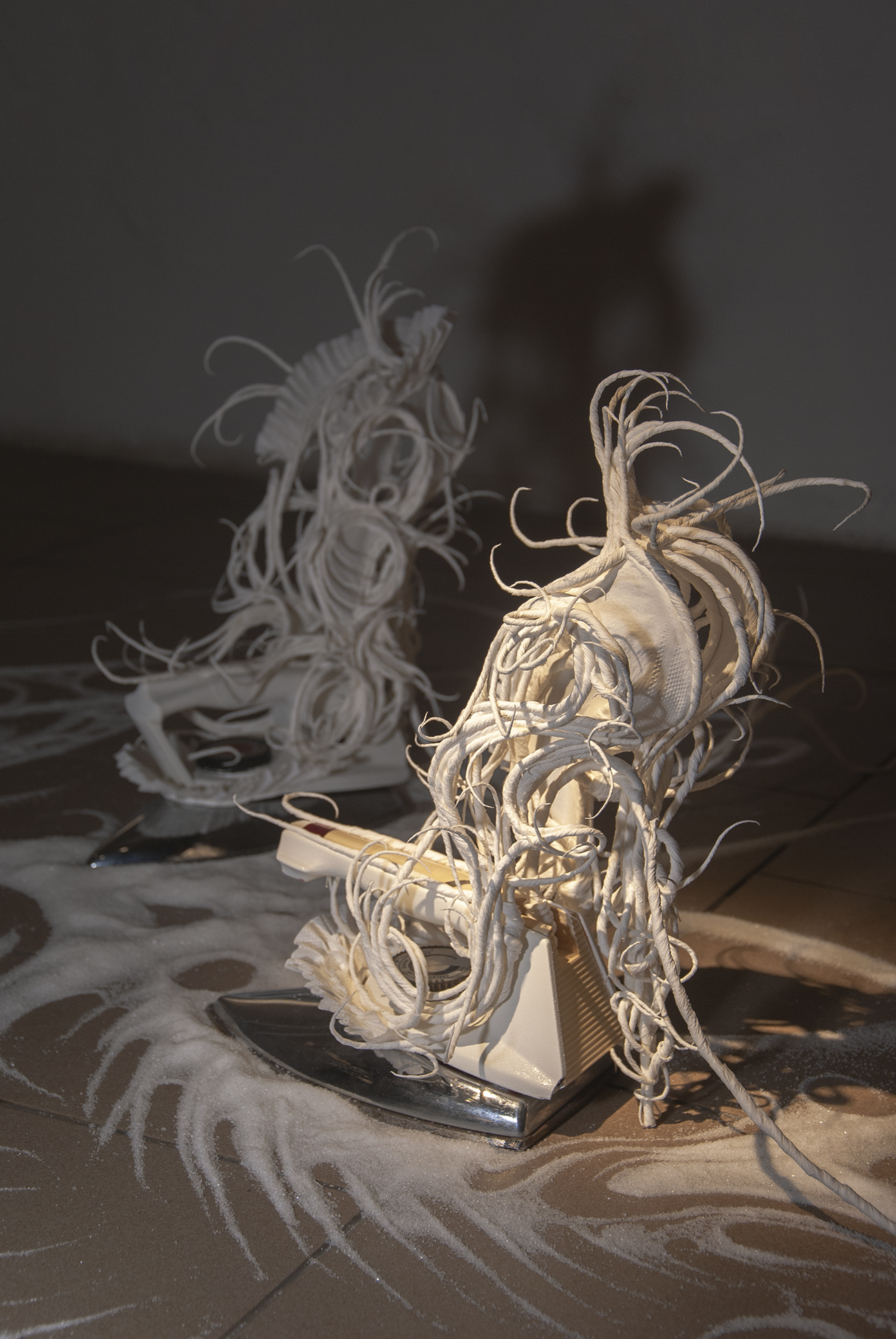 The desire for premium and luxury goods clashes with the reality experienced by Pavol Godiška, a recent art school graduate, as well as in the lives of countless other precarious individuals around the world, who face low personal economic capacity and material security. However, Godiška accepts these limitations and incorporates them into his work as the conceptual framework for his own artistic practice. What cannot be bought must be made. What cannot be afforded must be replaced with something else. Godiška replaces the perfect surfaces and precisely cut shapes of expensive, high-end materials with the most affordable ones possible. For example, in an older work, he used instant noodles as the source material for a replica of the iconic Birkin bag, the leather original of which, depending on the edition, ranges in price from tens to hundreds of thousands of euros. The result of this experiment, which in verbal description may sound like a comical DIY experiment in the vein of classics of the genre such as Jirka Babica or Láďa Hruška, is a surprisingly fragile, intimate, and sensitive work. Pavol Godiška achieves a similarly delicate result in a series of objects exhibited at Zaazrak|Dornych. This time, however, the mirror, high-heels, and corset are made of paper tissues, which grow out of ready-made household items as a representation of reality, in which the triviality of everyday home activities is replaced by uniqueness and beauty. In this peculiar still life, similar to those created by random constellations of clothes scattered around a room among furniture and other objects, themes of intimacy, ephemerality, personal identity, queerness, and subliminal criticism of capitalism are met thanks to sensitive handiwork and equally sensitively chosen materials. Thanks to its conceptual and craftsmanship quality, what began as a low-cost attempt to imitate an unattainable object ultimately describes an imaginary circle—and becomes a luxurious object of art.