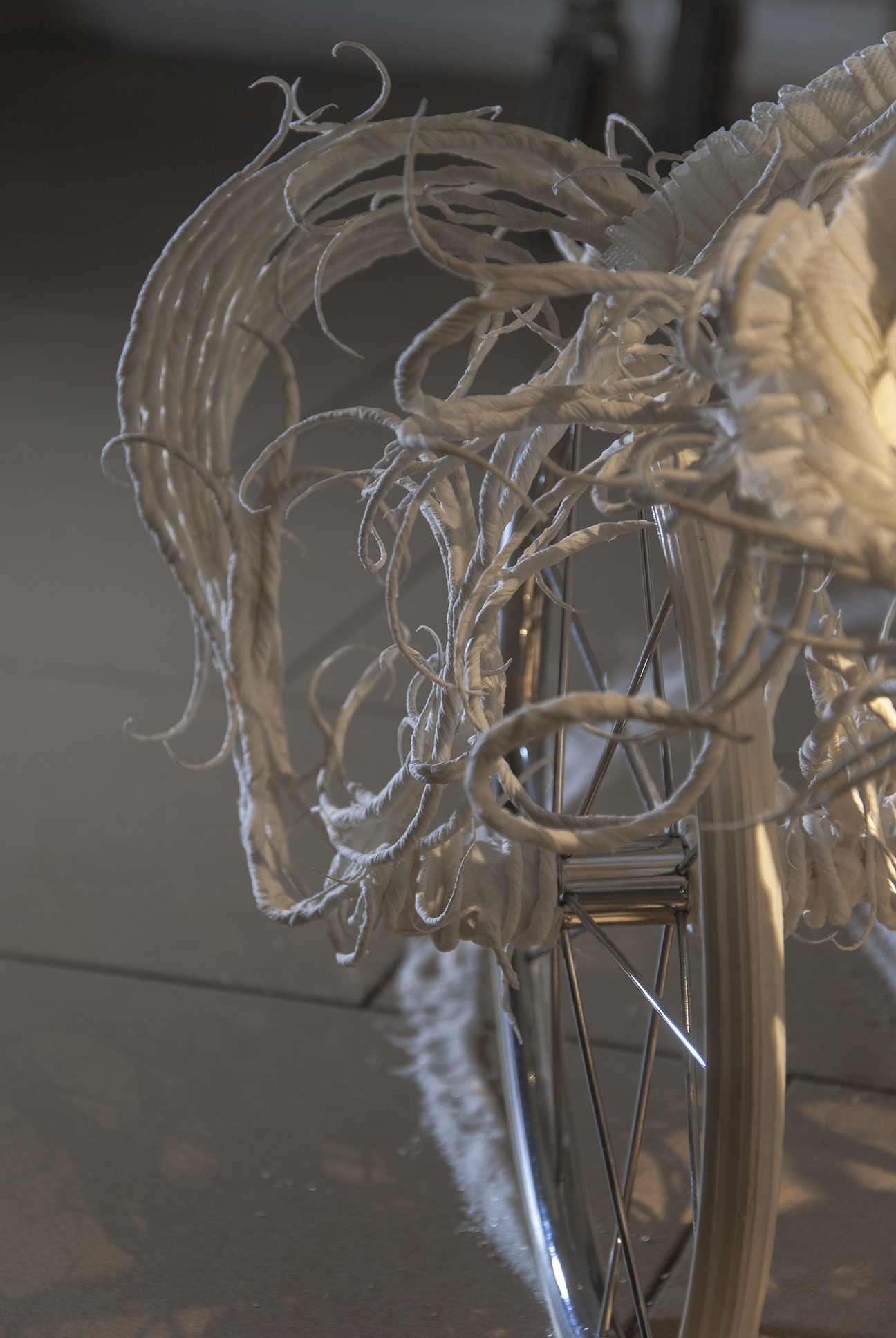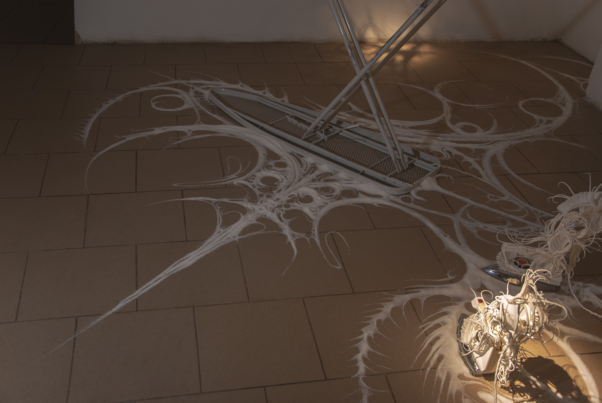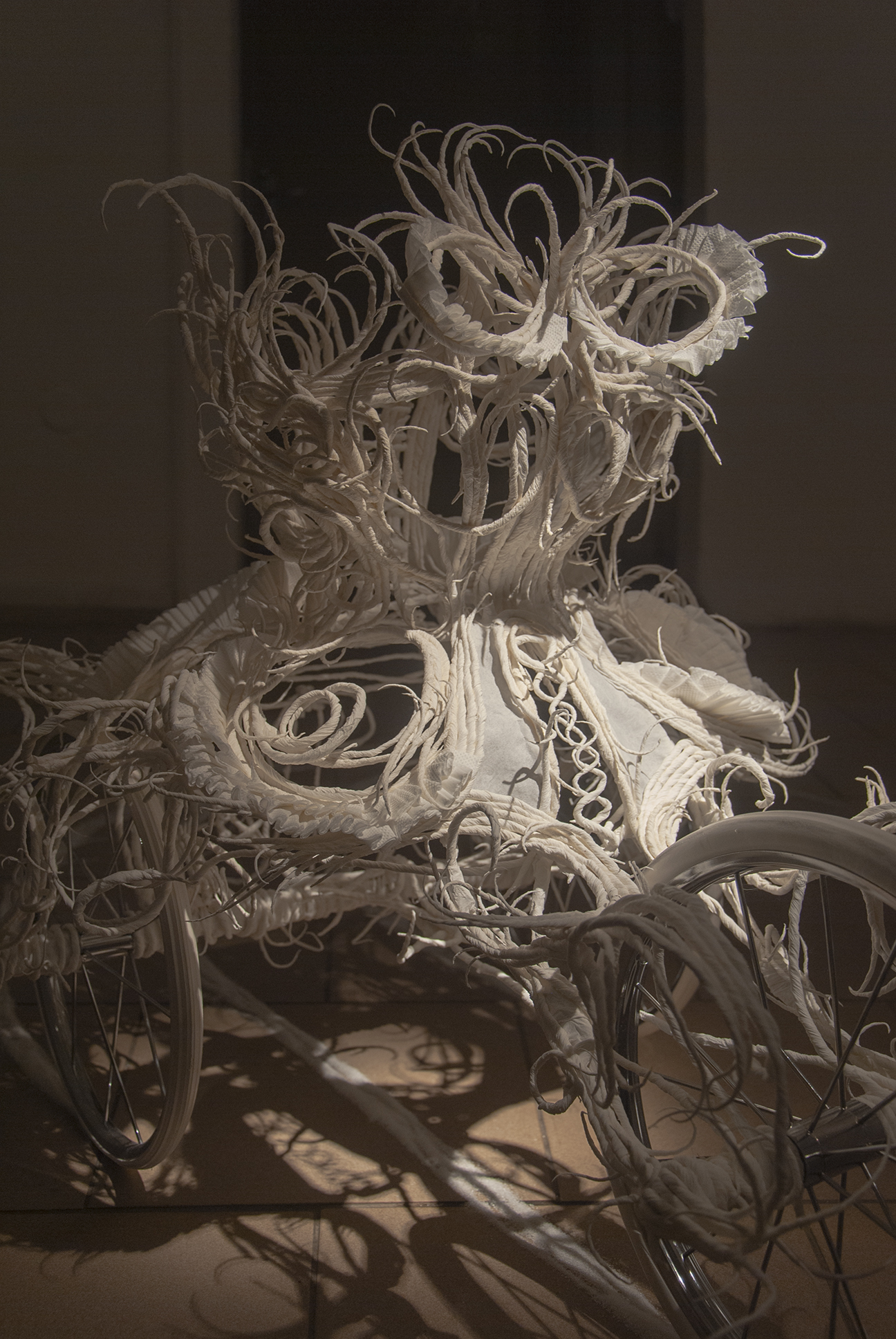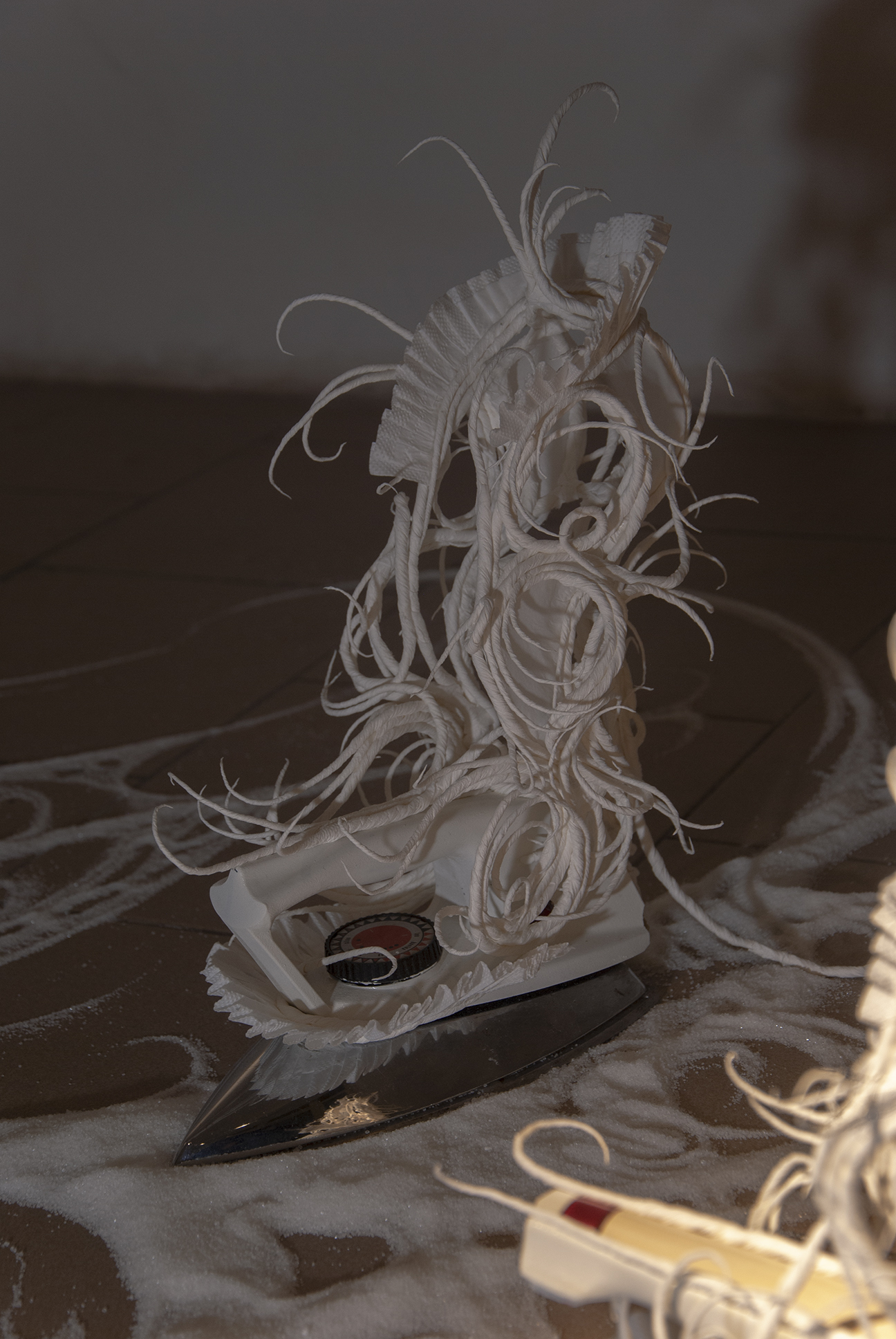 The desire for premium and luxury goods clashes with the reality experienced by Pavol Godiška, a recent art school graduate, as well as in the lives of countless other precarious individuals around the world, who face low personal economic capacity and material security. However, Godiška accepts these limitations and incorporates them into his work as the conceptual framework for his own artistic practice. What cannot be bought must be made. What cannot be afforded must be replaced with something else. Godiška replaces the perfect surfaces and precisely cut shapes of expensive, high-end materials with the most affordable ones possible. For example, in an older work, he used instant noodles as the source material for a replica of the iconic Birkin bag, the leather original of which, depending on the edition, ranges in price from tens to hundreds of thousands of euros. The result of this experiment, which in verbal description may sound like a comical DIY experiment in the vein of classics of the genre such as Jirka Babica or Láďa Hruška, is a surprisingly fragile, intimate, and sensitive work. Pavol Godiška achieves a similarly delicate result in a series of objects exhibited at Zaazrak|Dornych. This time, however, the mirror, high-heels, and corset are made of paper tissues, which grow out of ready-made household items as a representation of reality, in which the triviality of everyday home activities is replaced by uniqueness and beauty. In this peculiar still life, similar to those created by random constellations of clothes scattered around a room among furniture and other objects, themes of intimacy, ephemerality, personal identity, queerness, and subliminal criticism of capitalism are met thanks to sensitive handiwork and equally sensitively chosen materials. Thanks to its conceptual and craftsmanship quality, what began as a low-cost attempt to imitate an unattainable object ultimately describes an imaginary circle—and becomes a luxurious object of art.