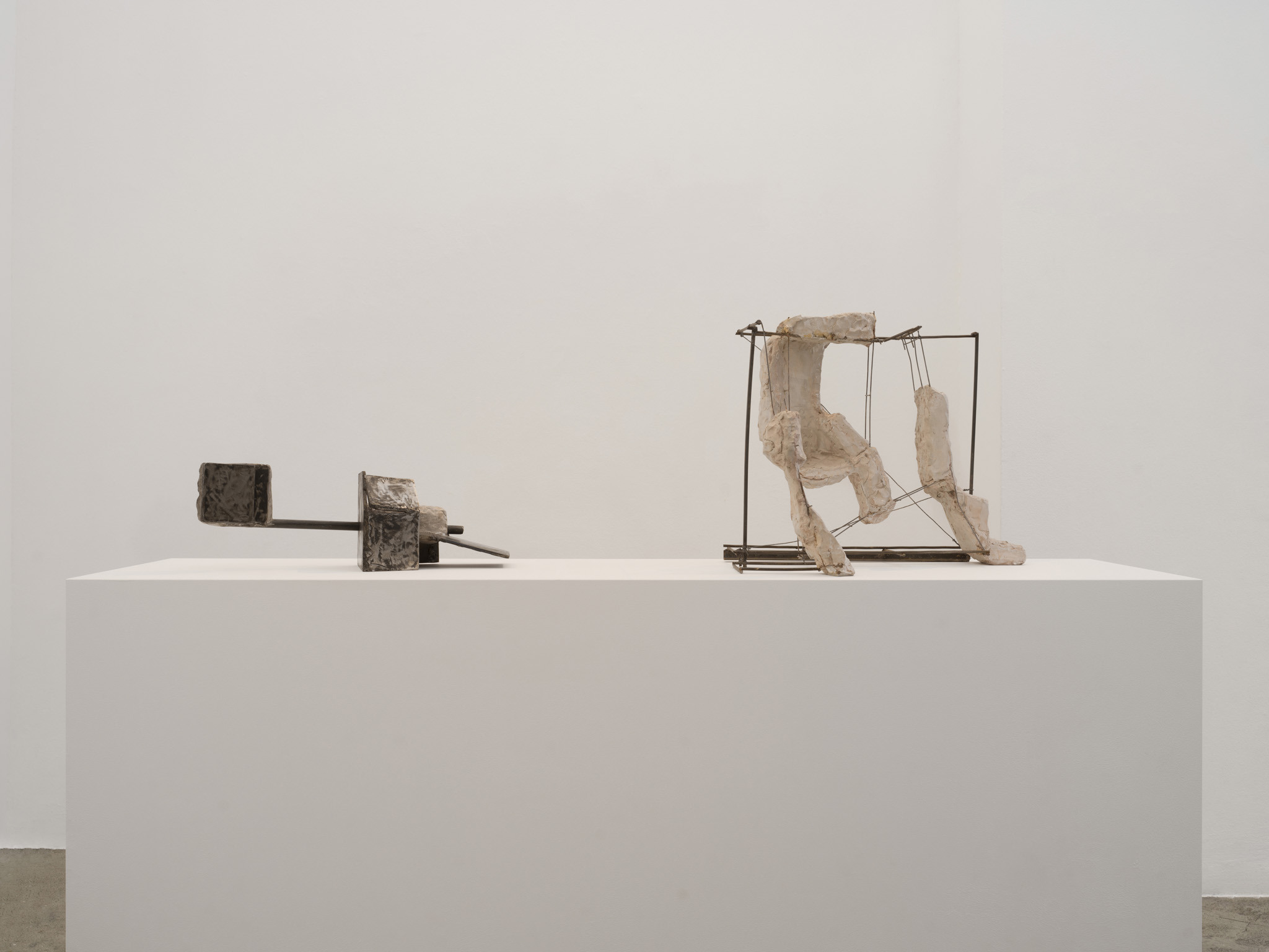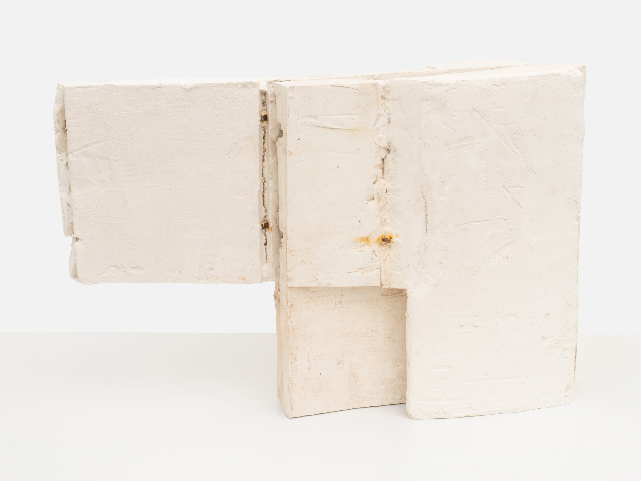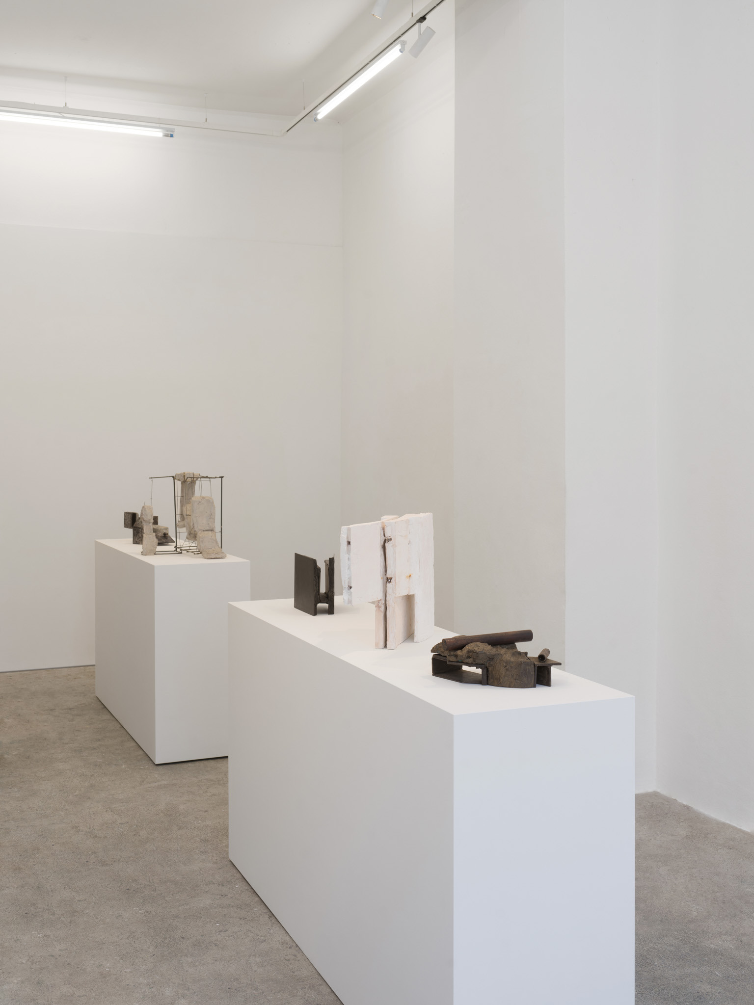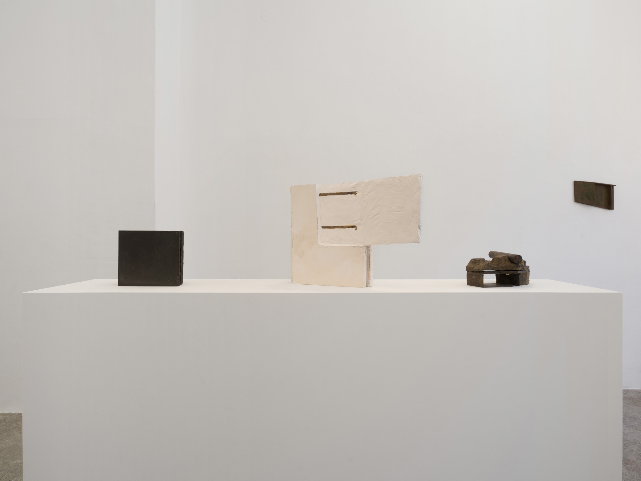 Their scale is disarming. These are not preparatory models for something monumental; they are complete in their modest dimensions. You find yourself stepping closer, bending slightly, tracking the seams where materials meet. Surfaces bear the trace of handling – scuffed metal, compressed plaster, edges that feel worked rather than machined. What initially reads as austere abstraction slowly reveals a charged interiority.