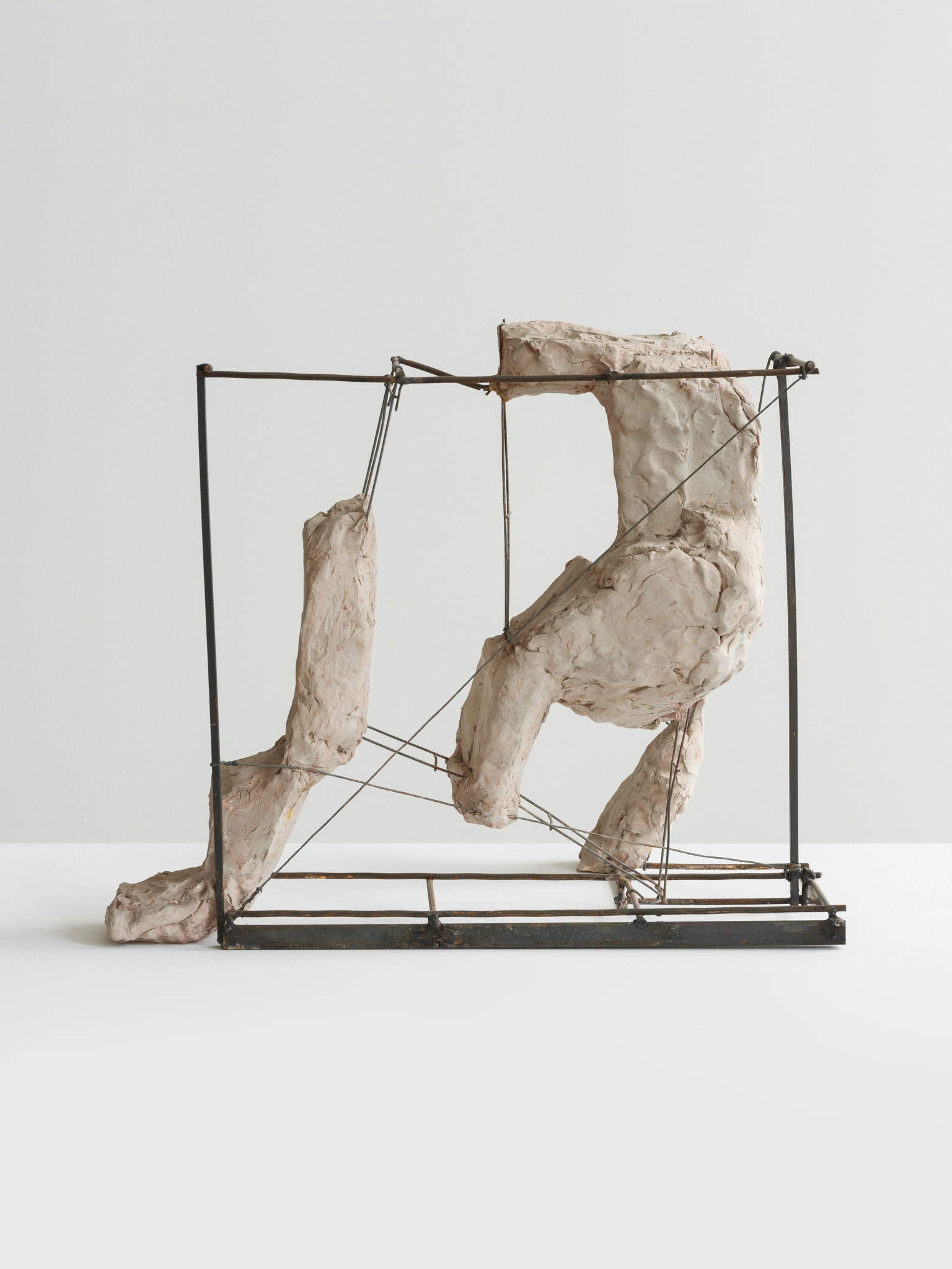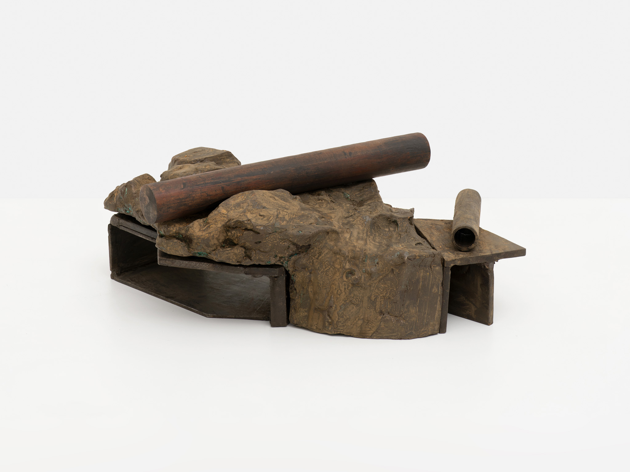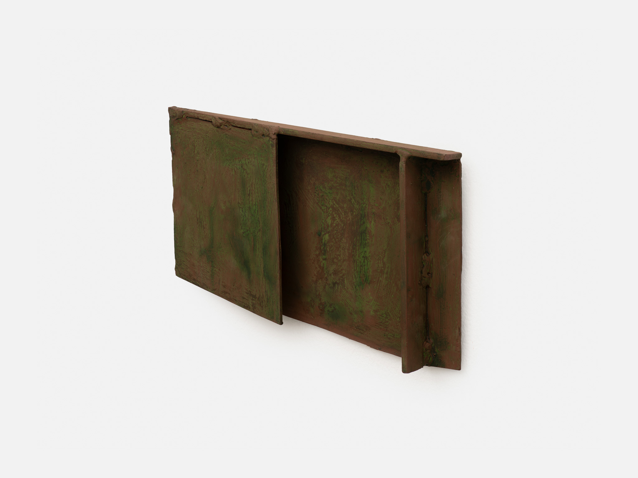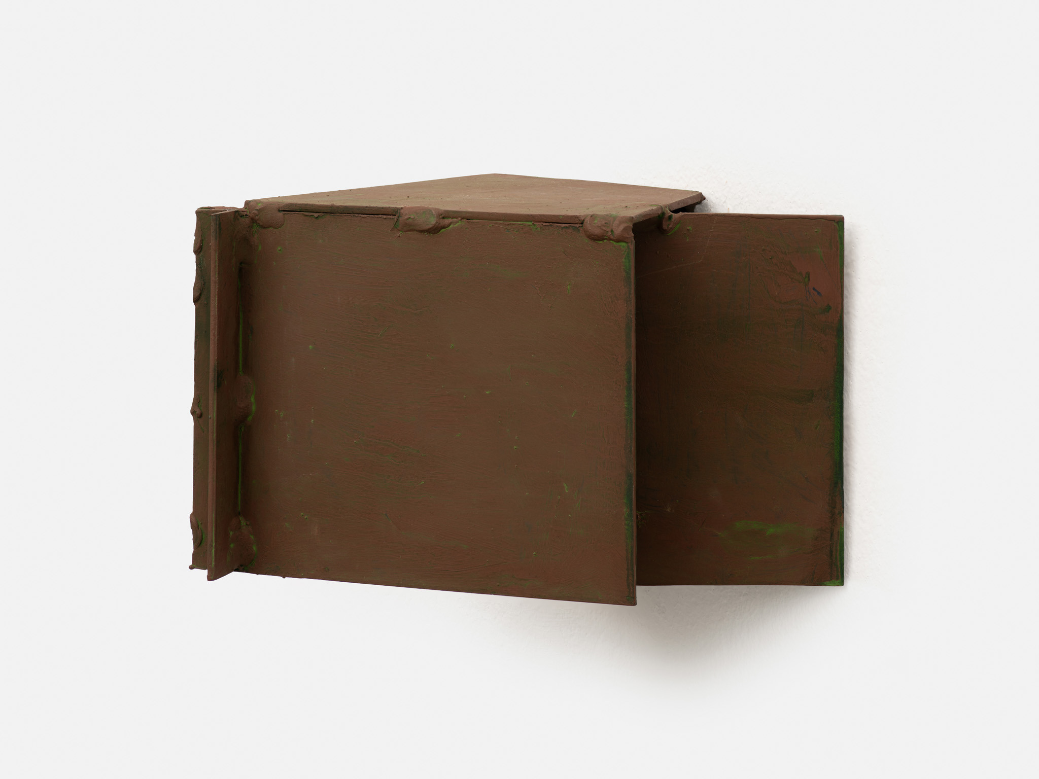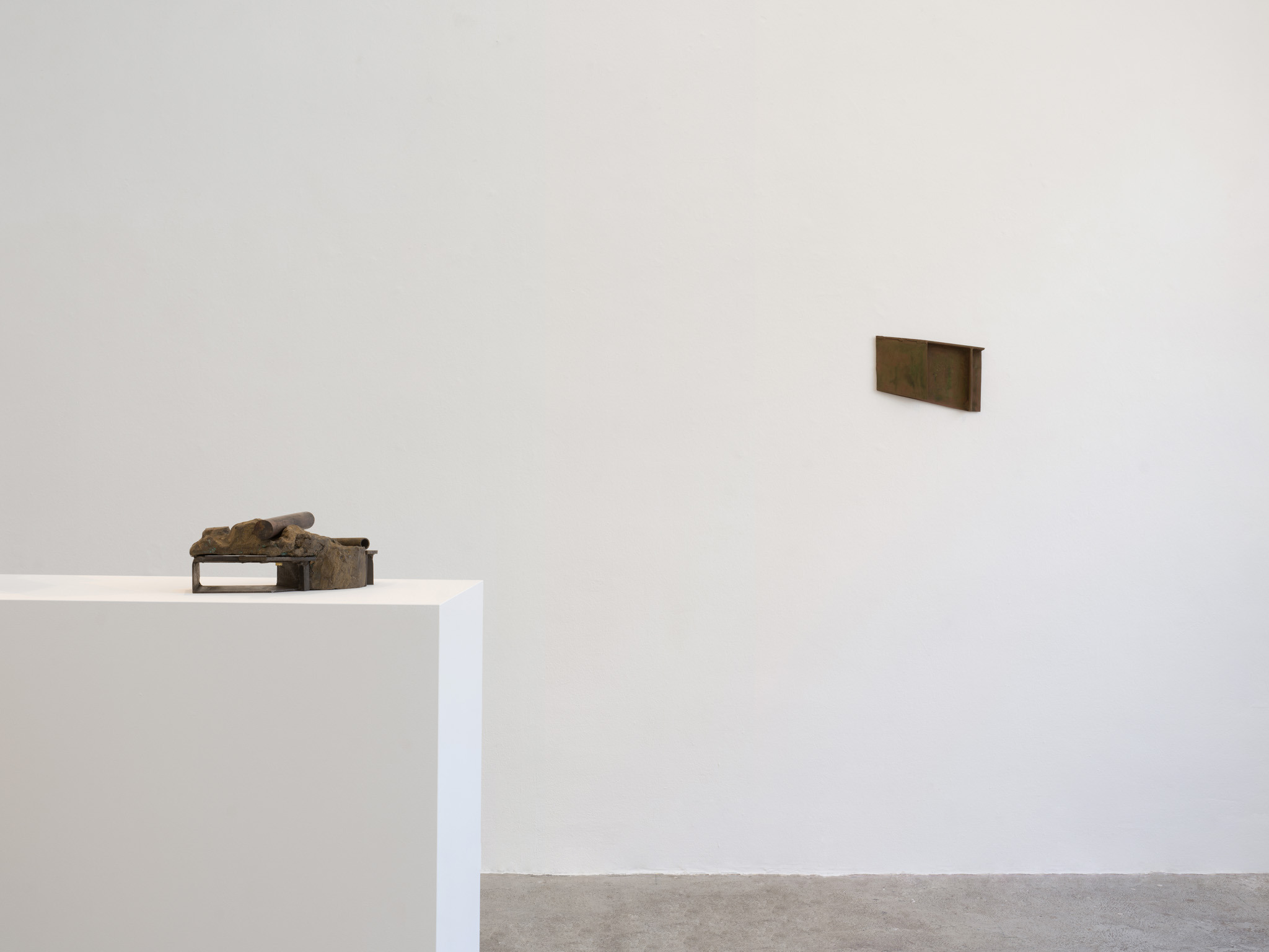 Their scale is disarming. These are not preparatory models for something monumental; they are complete in their modest dimensions. You find yourself stepping closer, bending slightly, tracking the seams where materials meet. Surfaces bear the trace of handling – scuffed metal, compressed plaster, edges that feel worked rather than machined. What initially reads as austere abstraction slowly reveals a charged interiority.