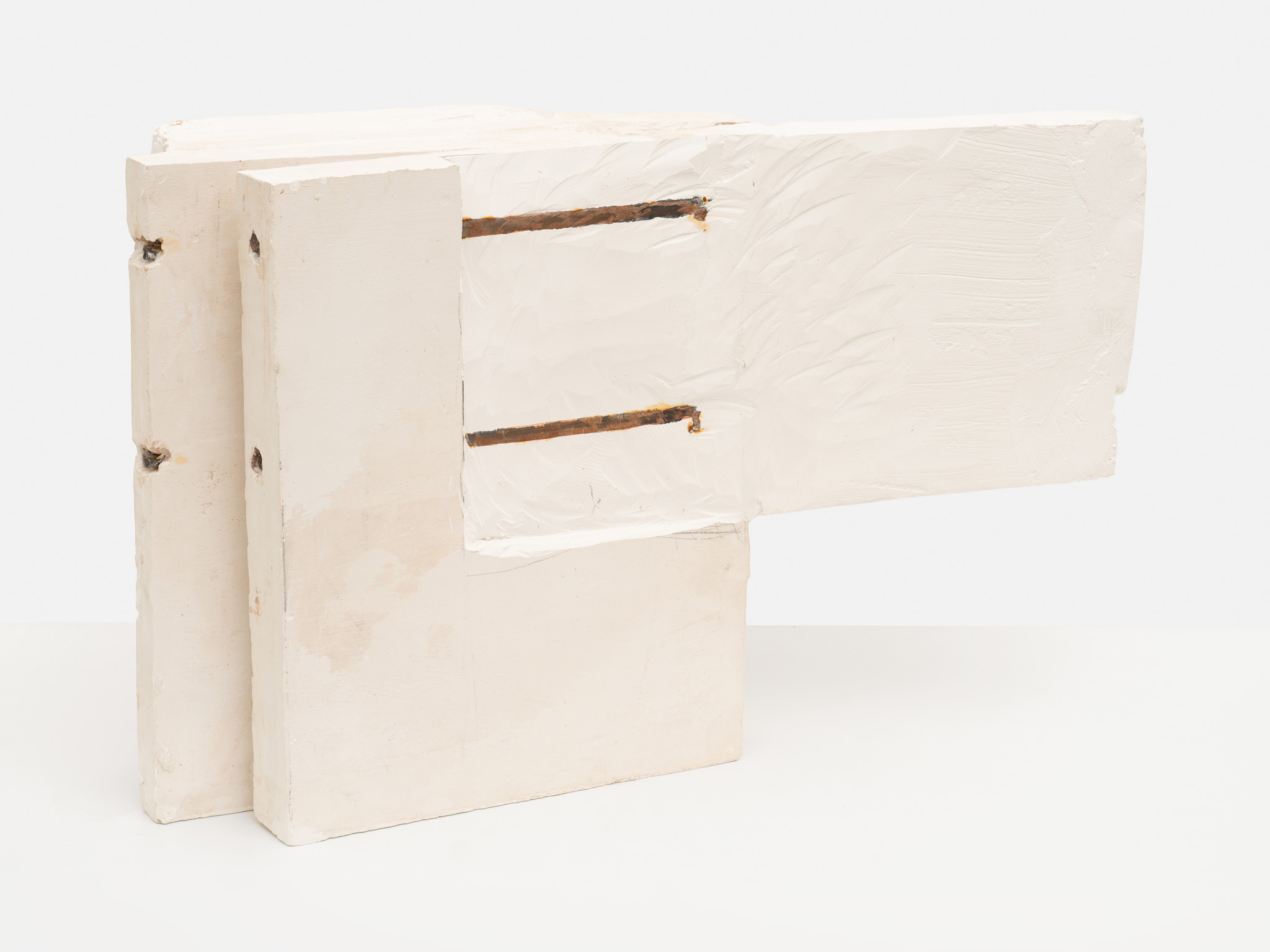 Throughout the exhibition, structure operates as both form and metaphor. A roof-like angle suggests shelter while exposing emptiness beneath. A rod piercing a block reads simultaneously as reinforcement and intrusion. Weight is palpable; gravity feels present. Yet there is also a surprising tenderness in how these elements rely on one another. Support and strain coexist.