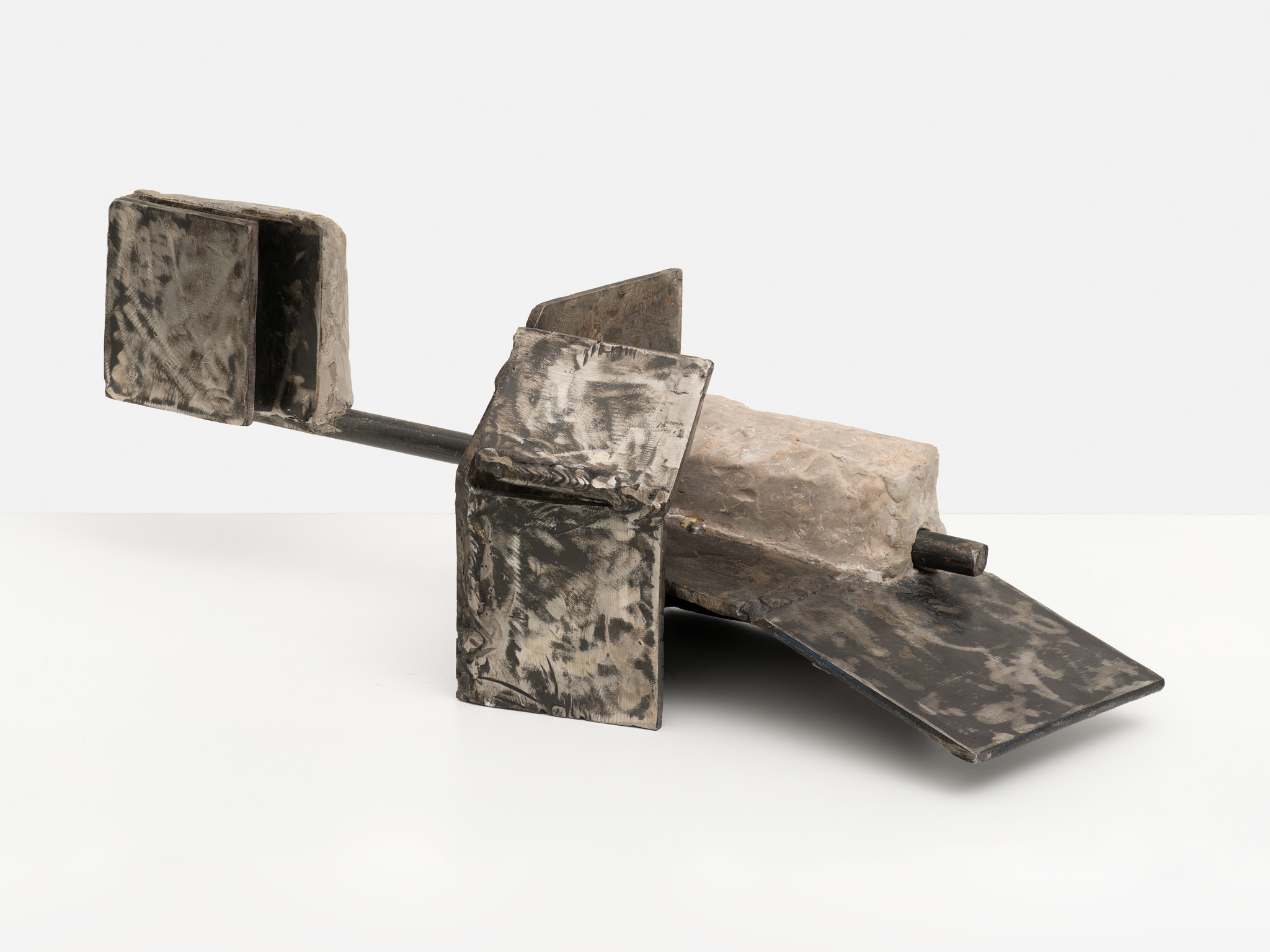 When looking at Jones’ sculptures, you encounter structures that feel caught mid-adjustment. Planes lean into one another, a slab presses against a pitched surface, a dark metal sheet braces a dense, pale mass. Nothing appears fixed beyond doubt. Each element seems to test its own stability, as if balance were an ongoing negotiation rather than a settled fact.